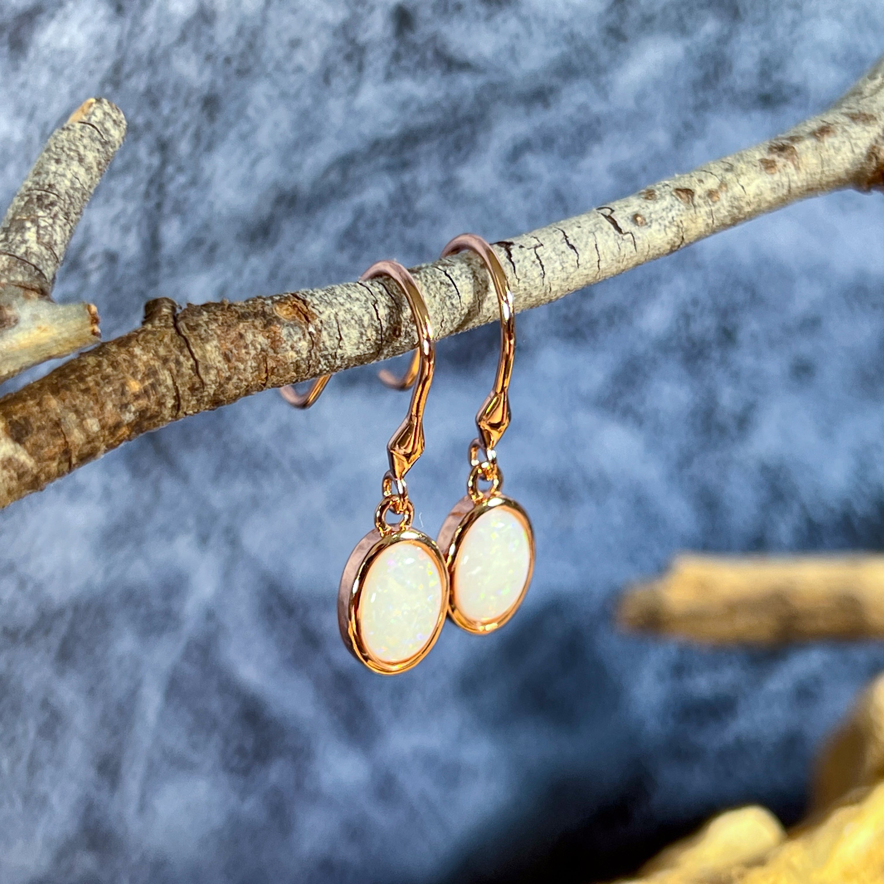 Rose Gold plated Silver danglng bezel set White Opals on hooks