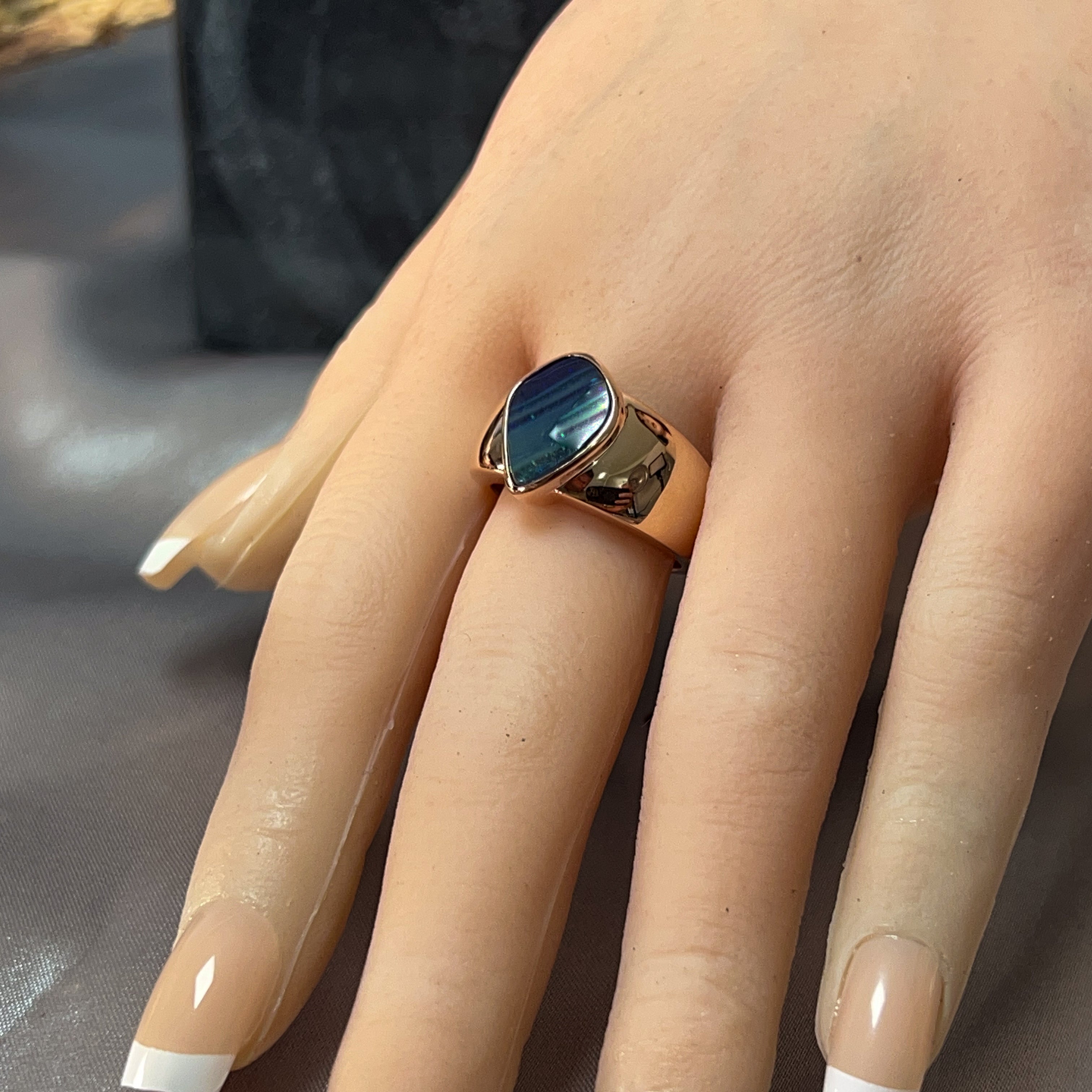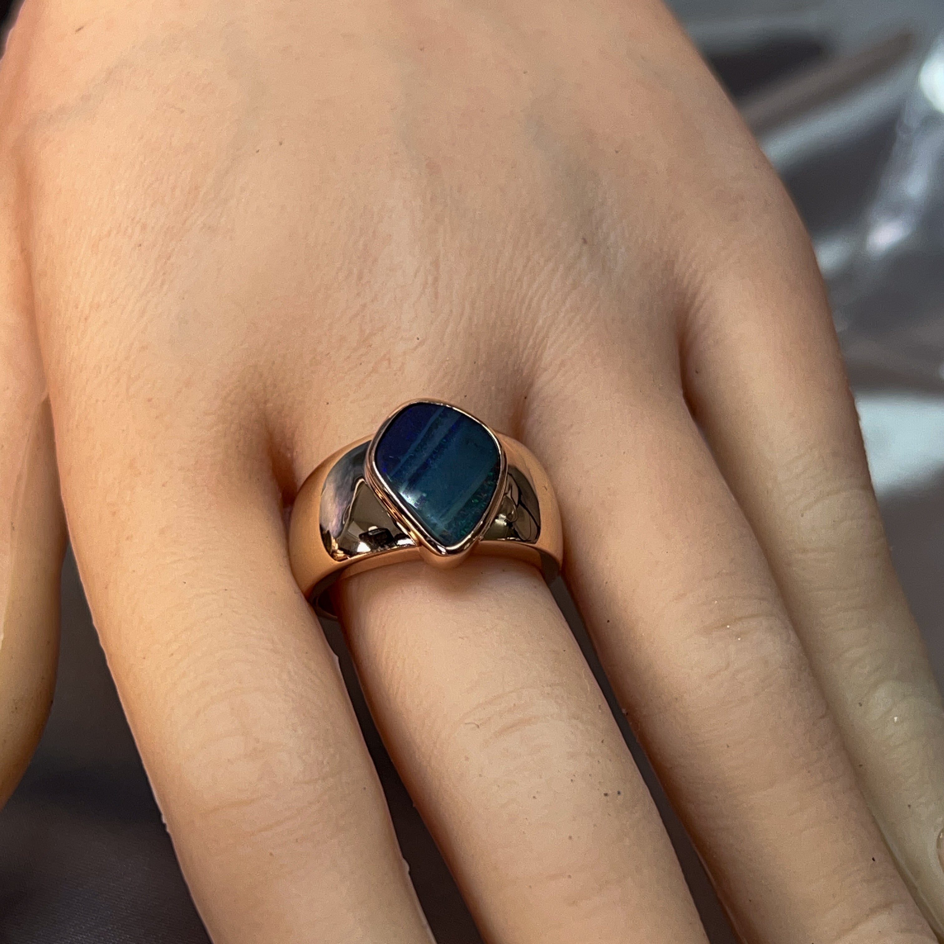Slip on pure elegance with this stunning rose gold plated sterling silver ring, crowned with a magnificent 4.6ct boulder opal. Watch the stone dance with fiery flashes of colour—each glance reveals something new and magical. The warm rose gold setting perfectly complements the opal's natural beauty, creating a piece that's equal parts sophisticated and whimsical. Perfect for those who dare to stand out and celebrate the extraordinary. A true showstopper that'll have everyone asking where you found it.