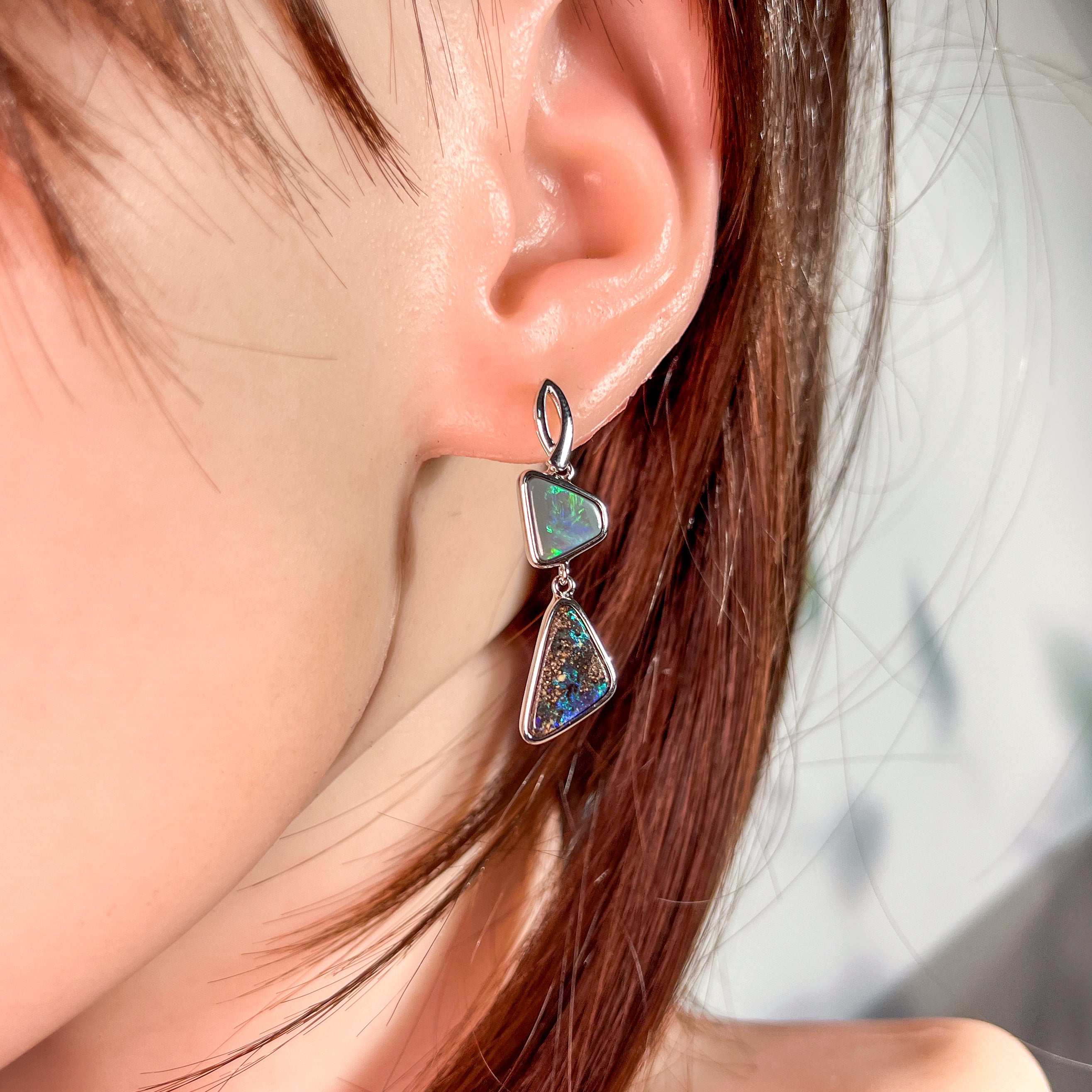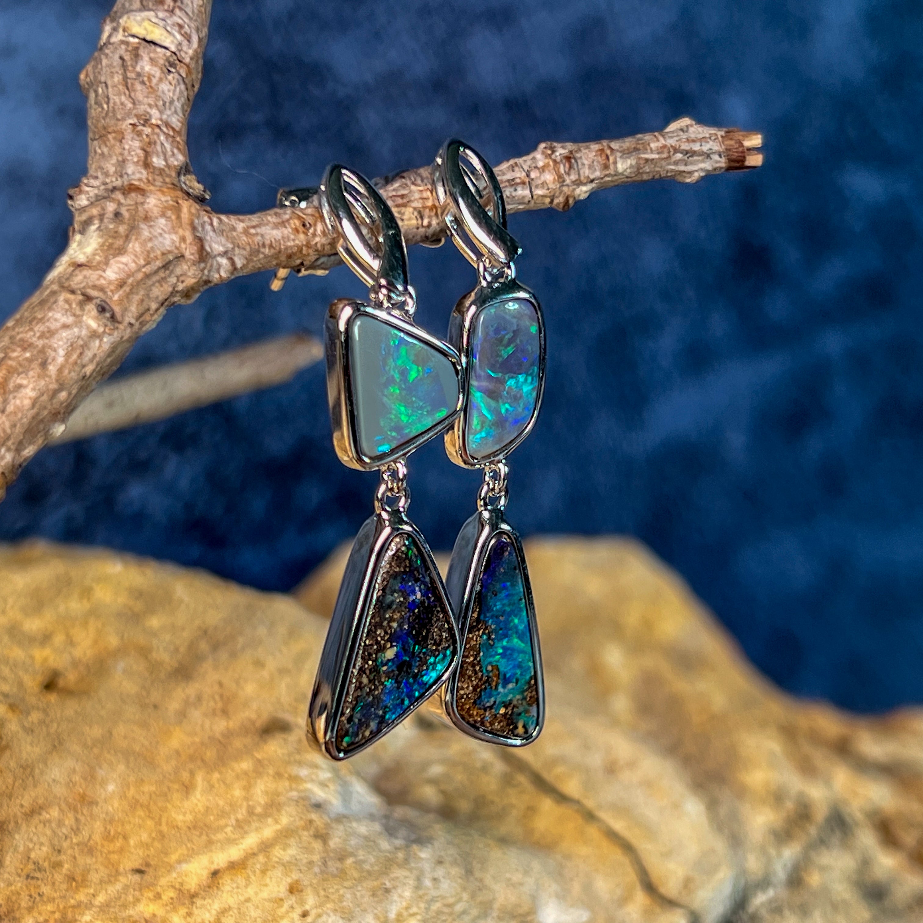 Add a touch of unique elegance to your style with these Sterling Silver Black Opal and Boulder Opal dangling earrings. Handcrafted with natural freeform boulder opals, these earrings make the perfect gift for any jewelry lover. Stand out from the crowd and embrace your individuality with these one-of-a-kind pieces.