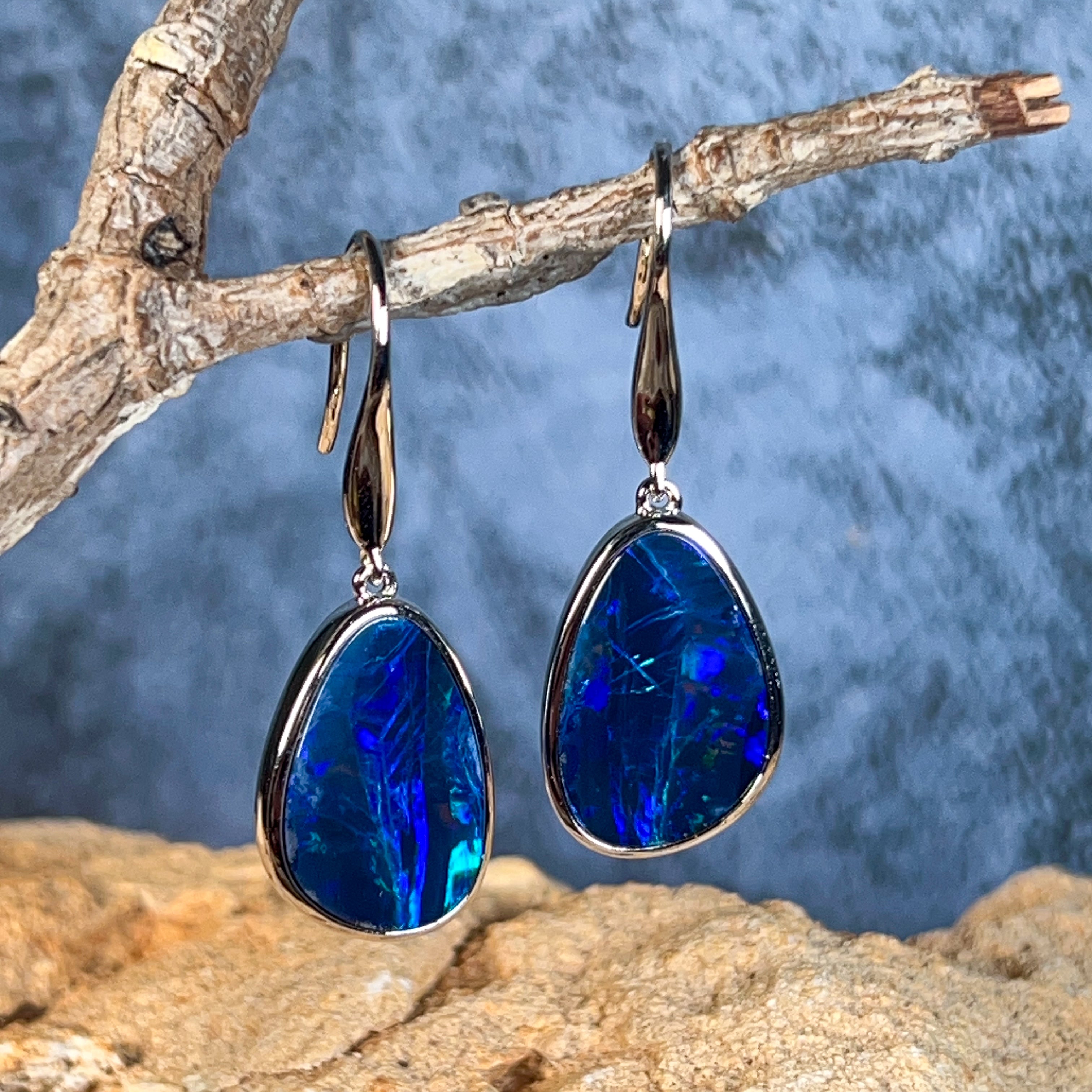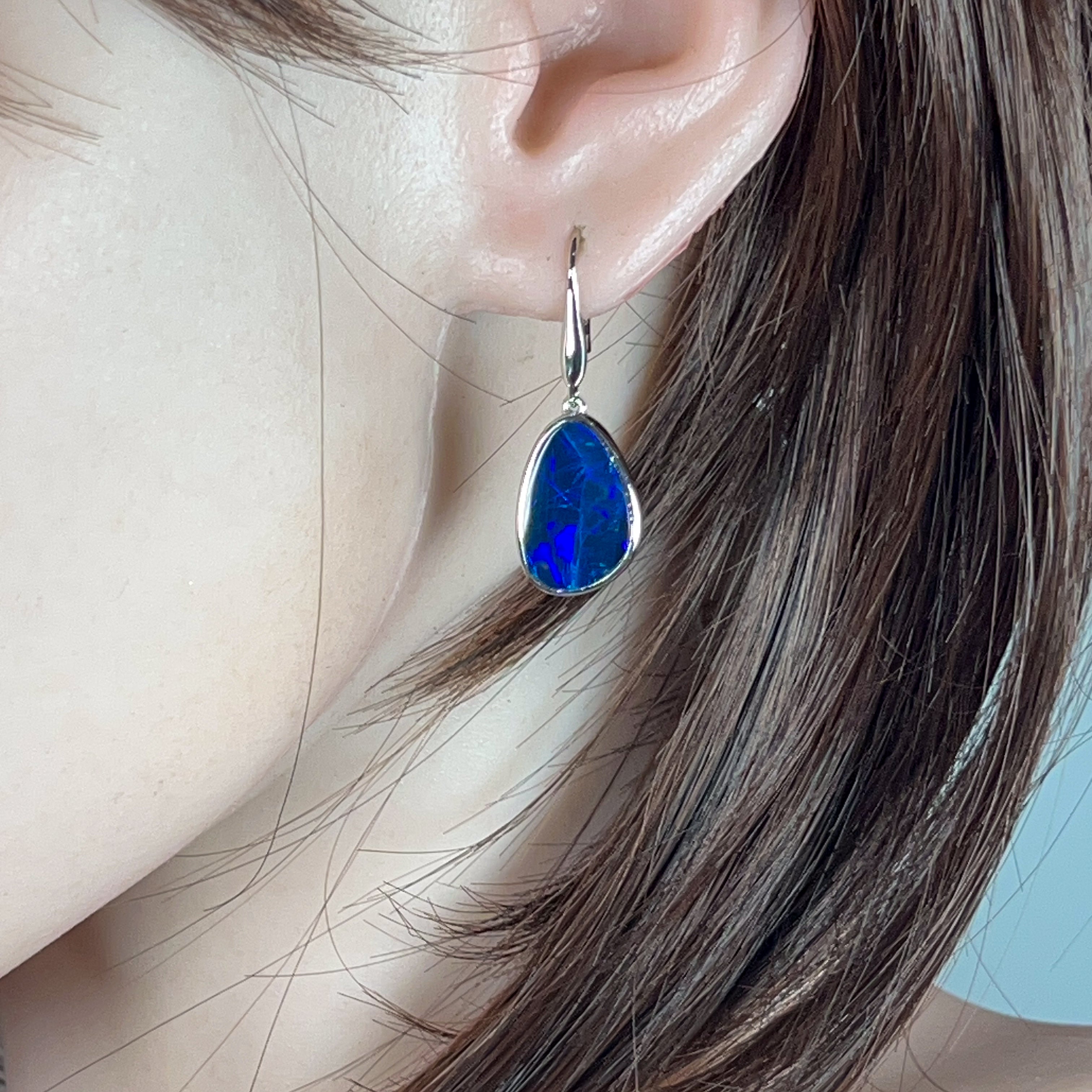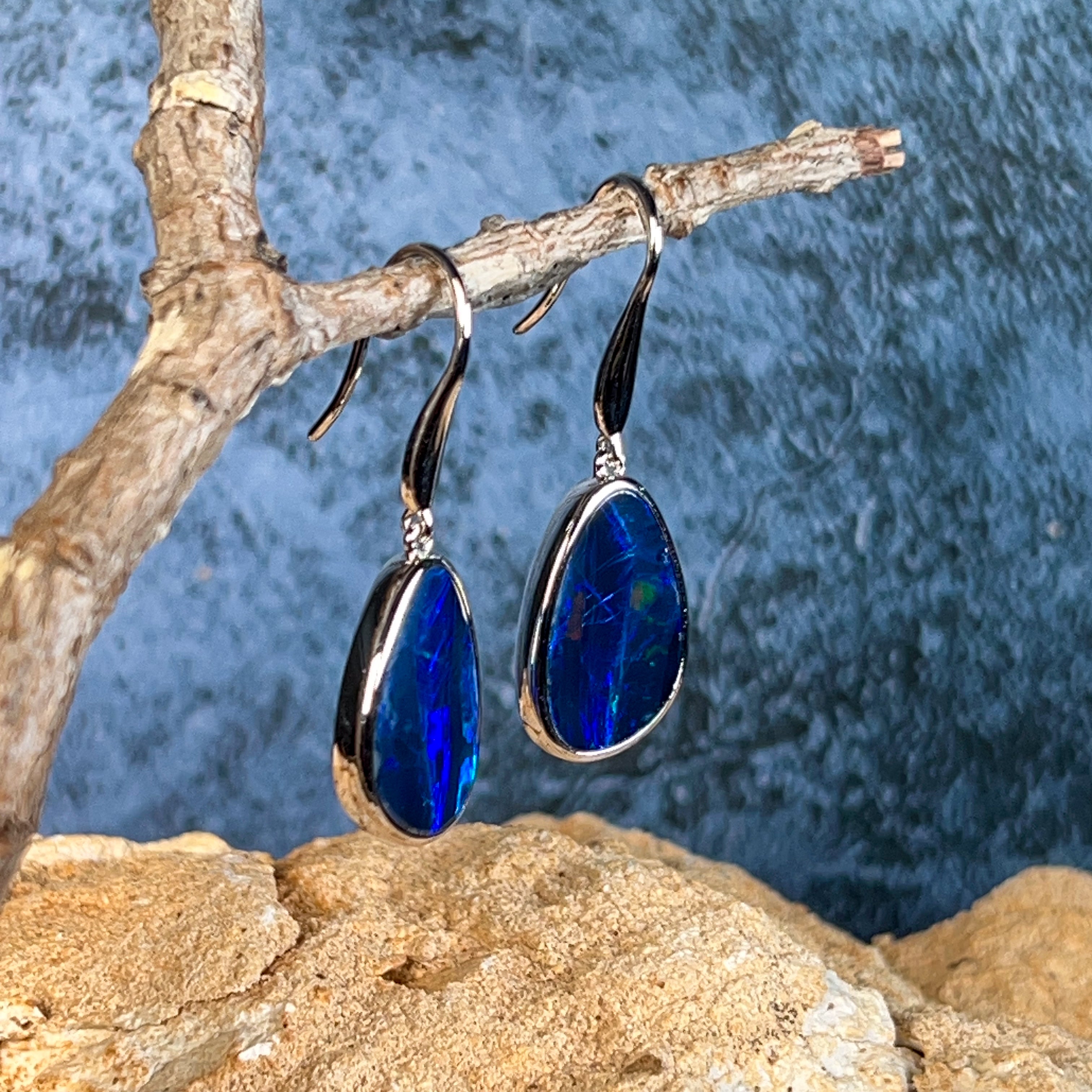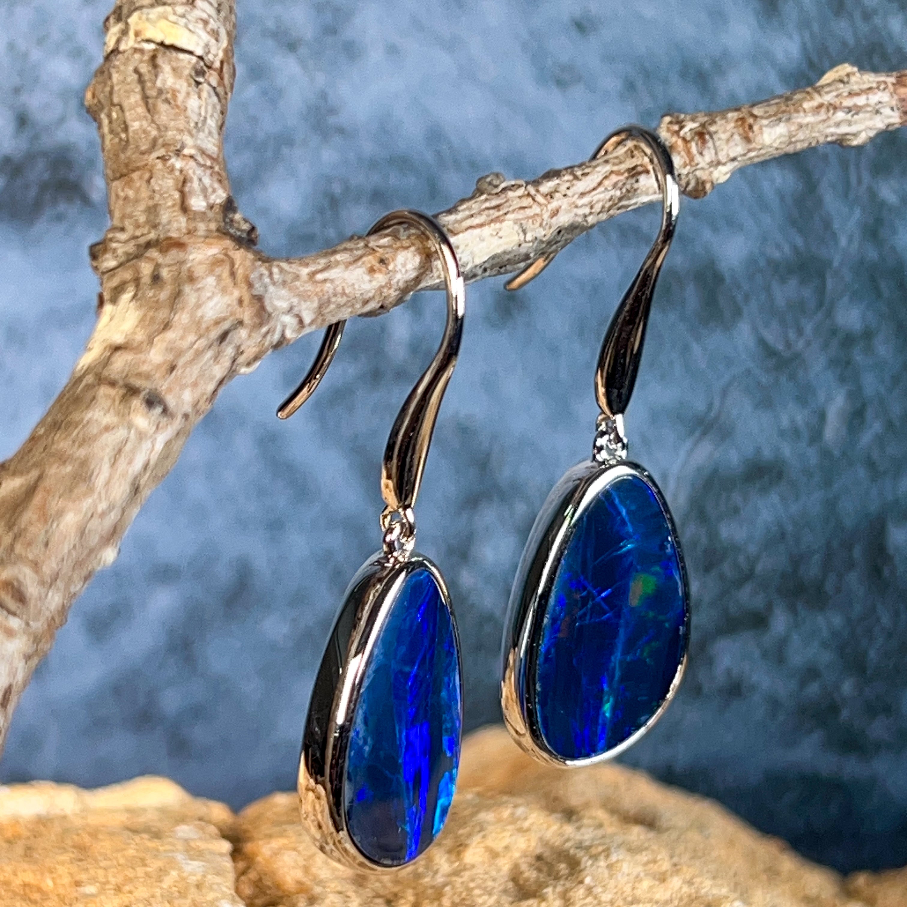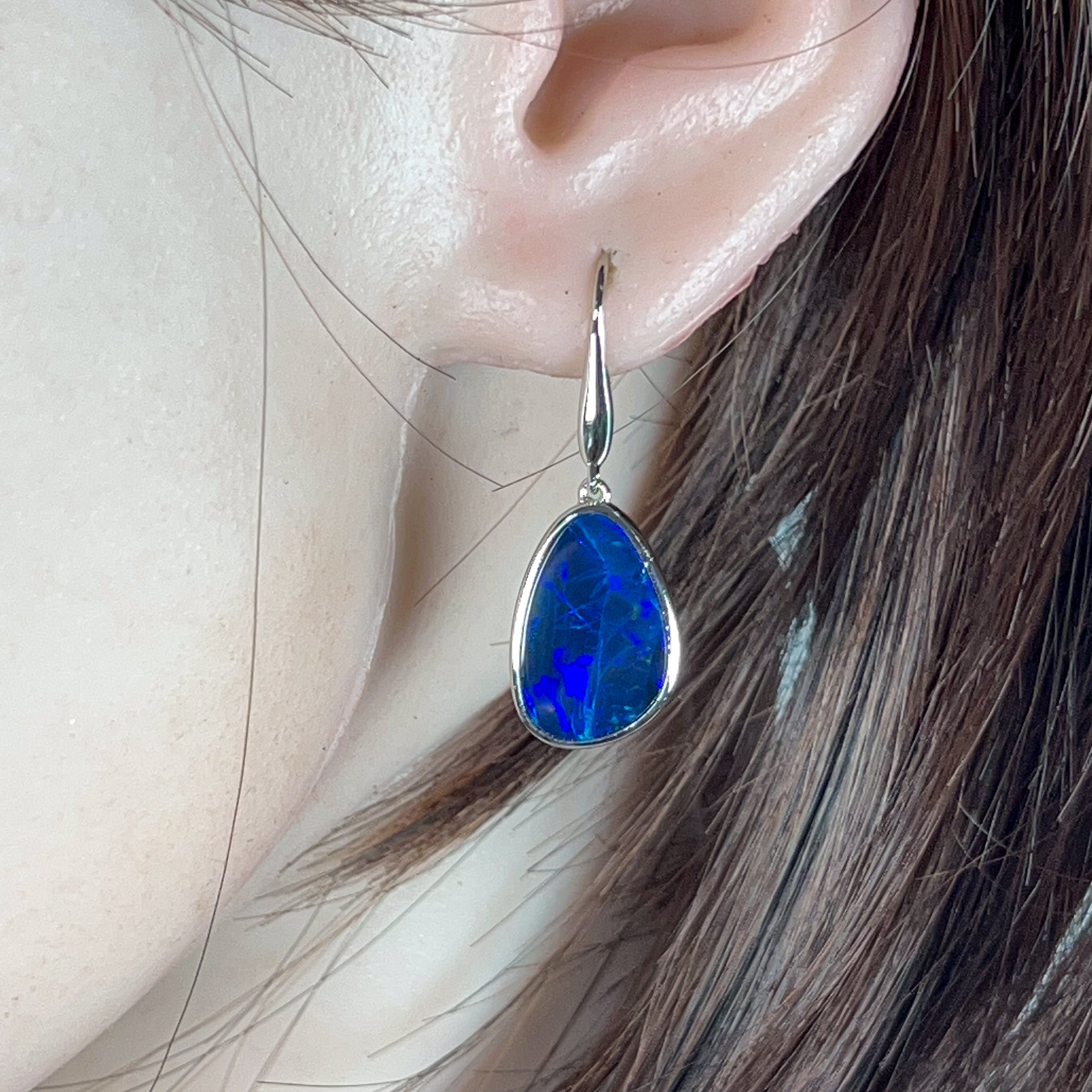 Dive into the depths of elegance with these stunning sterling silver blue opal doublet earrings. Each piece showcases a mesmerizing 7.46ct blue opal that catches the light with oceanic brilliance, suspended gracefully on polished silver hooks. Perfect for adding a splash of colour and movement to any outfit, these dangling beauties bring a playful sophistication to your jewellery collection. Whether you're dressing up for a special occasion or elevating your everyday style, these earrings deliver that perfect balance of whimsy and refinement.
