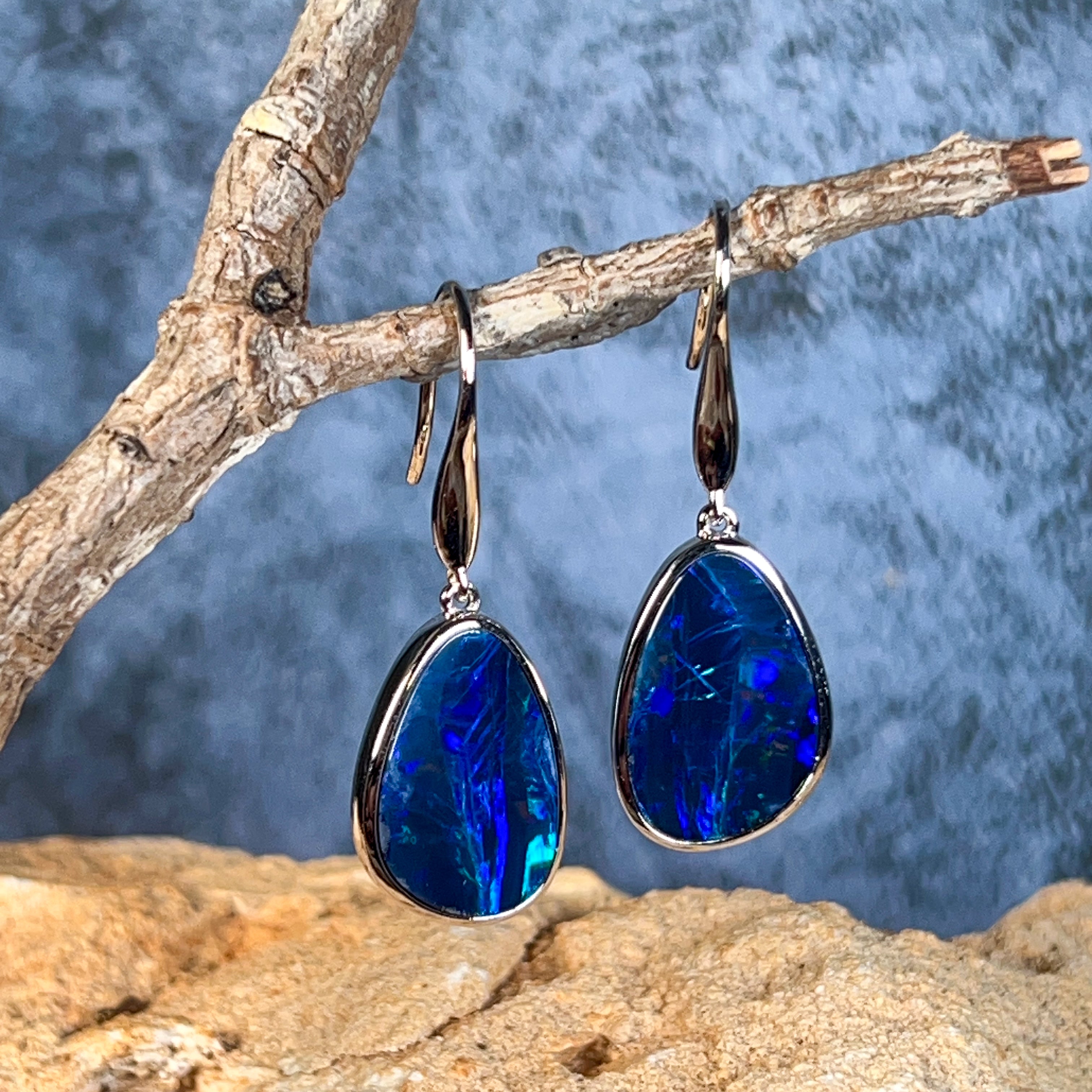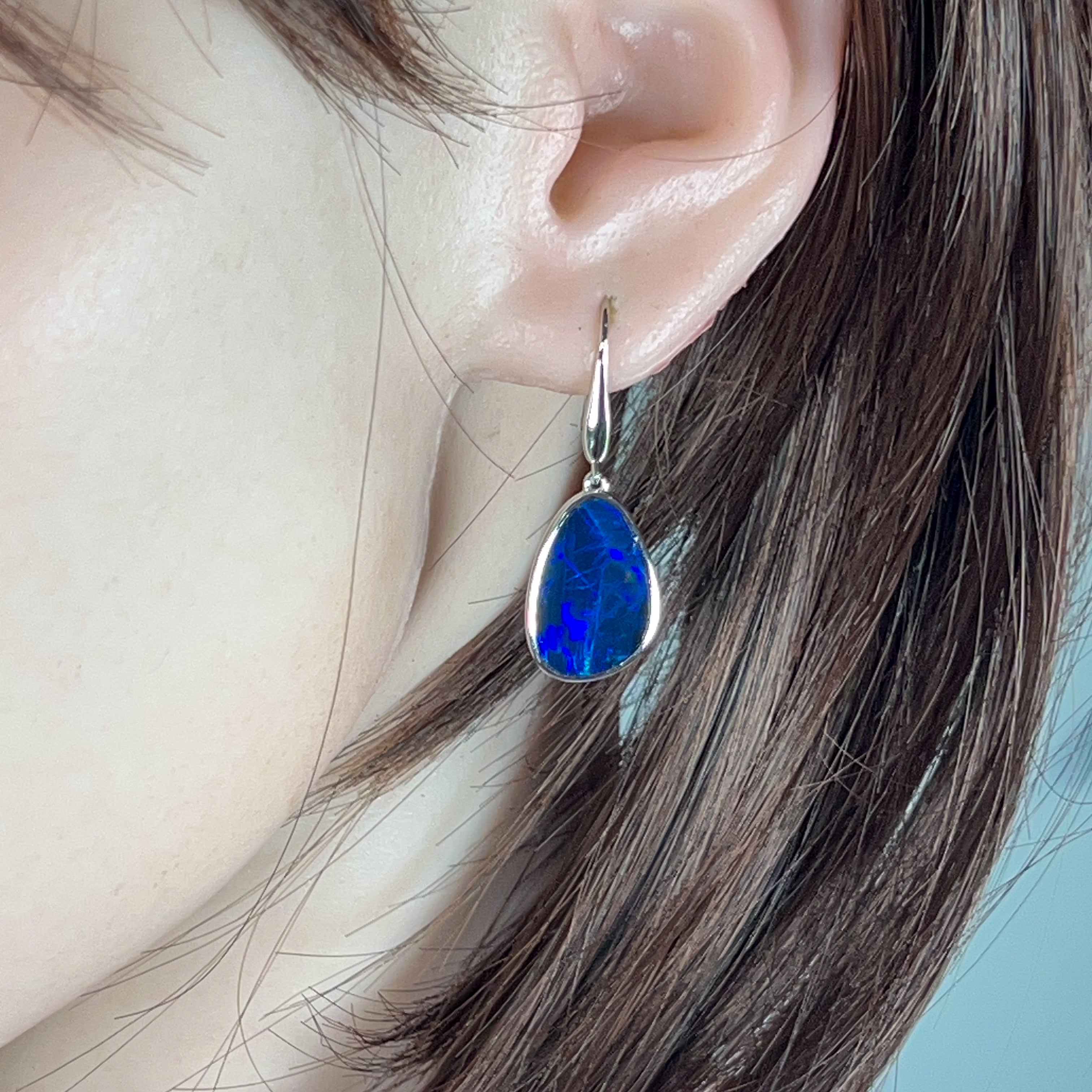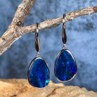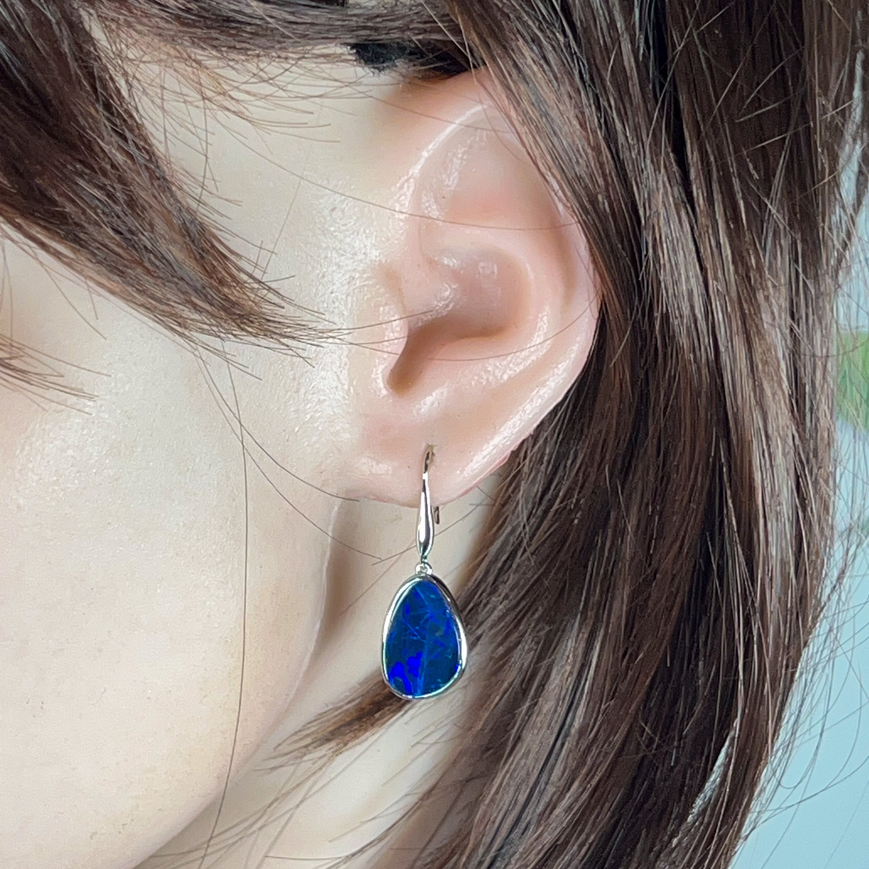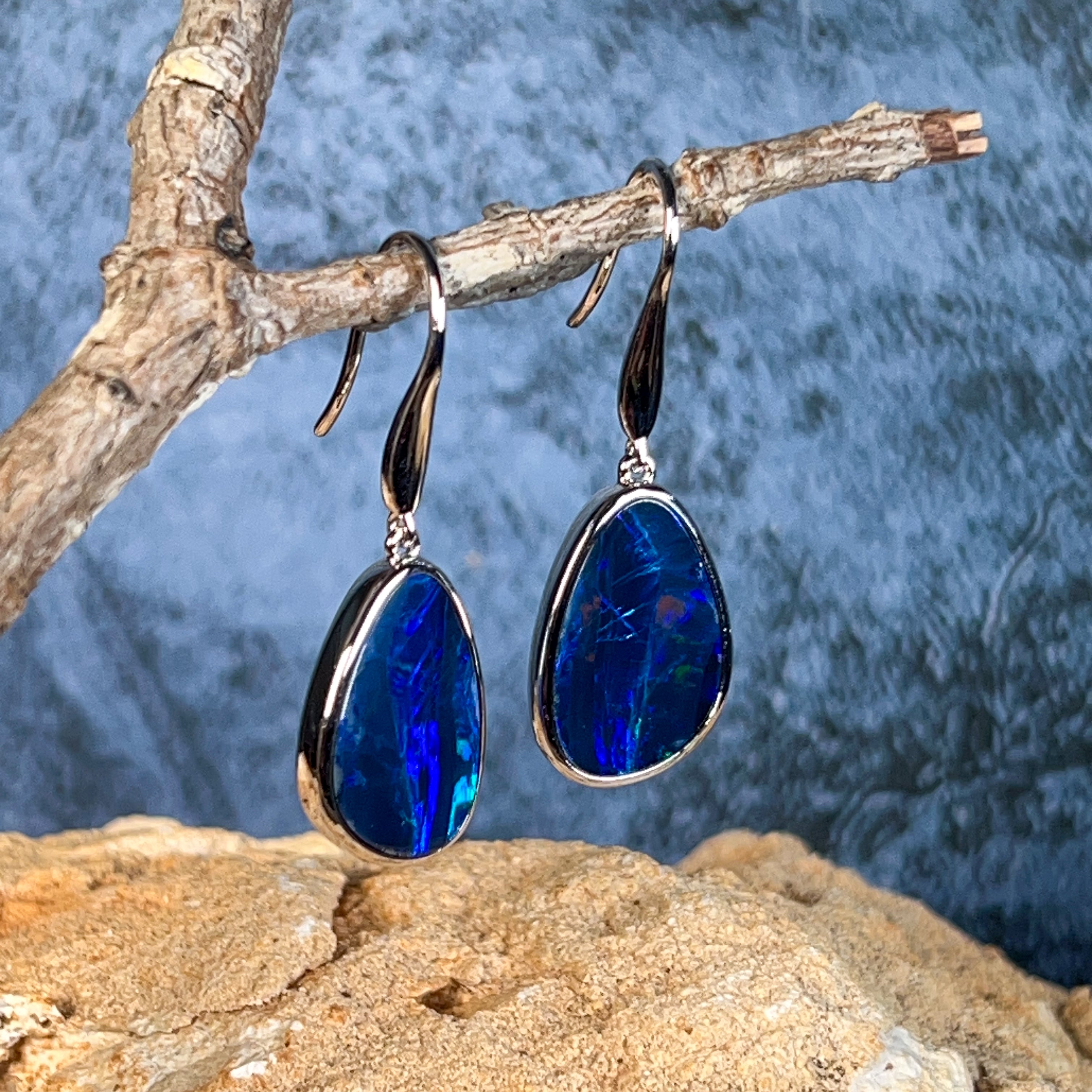 Dive into the depths of elegance with these stunning sterling silver blue opal doublet earrings. Each piece showcases a mesmerizing 7.46ct blue opal that catches the light with oceanic brilliance, suspended gracefully on polished silver hooks. Perfect for adding a splash of colour and movement to any outfit, these dangling beauties bring a playful sophistication to your jewellery collection. Whether you're dressing up for a special occasion or elevating your everyday style, these earrings deliver that perfect balance of whimsy and refinement.