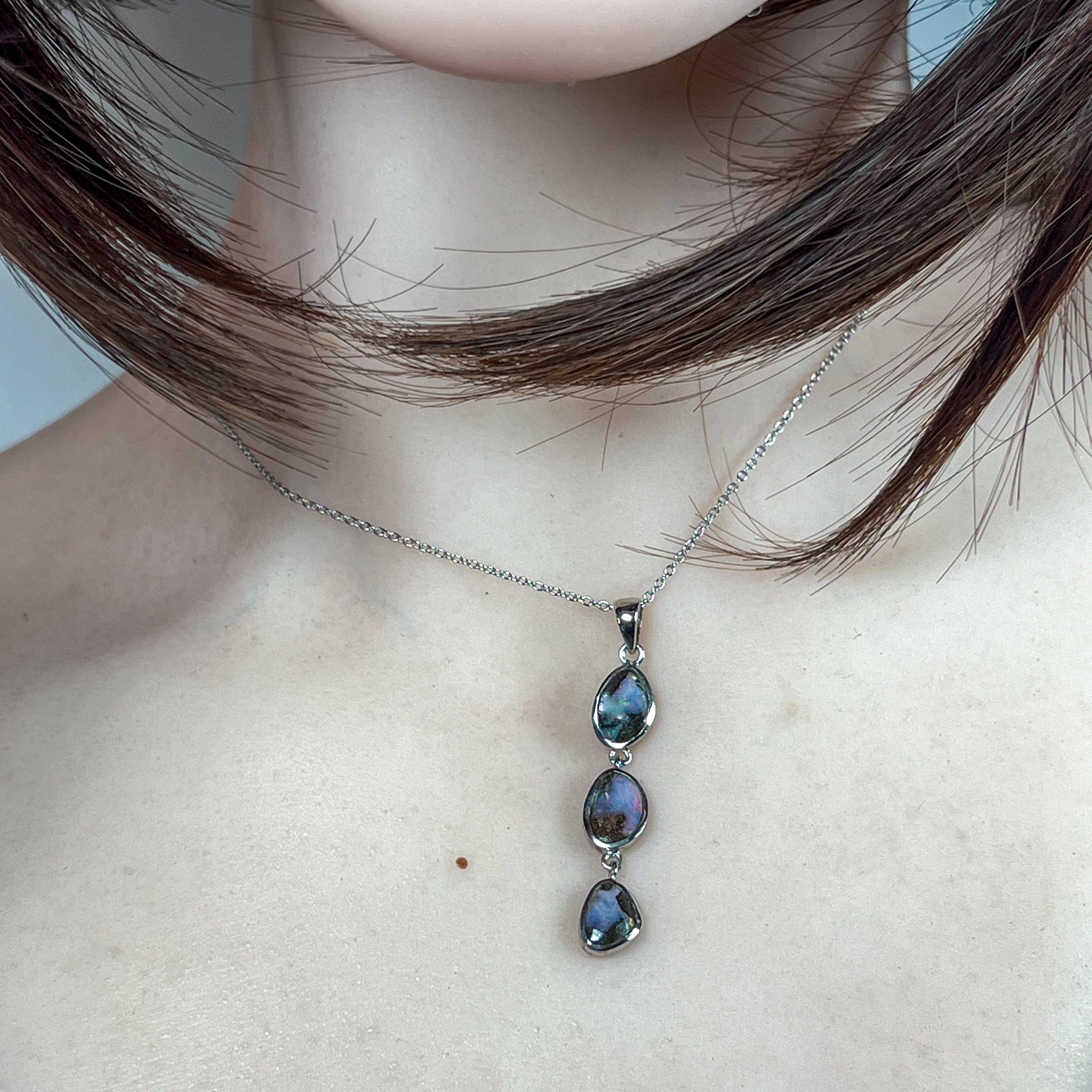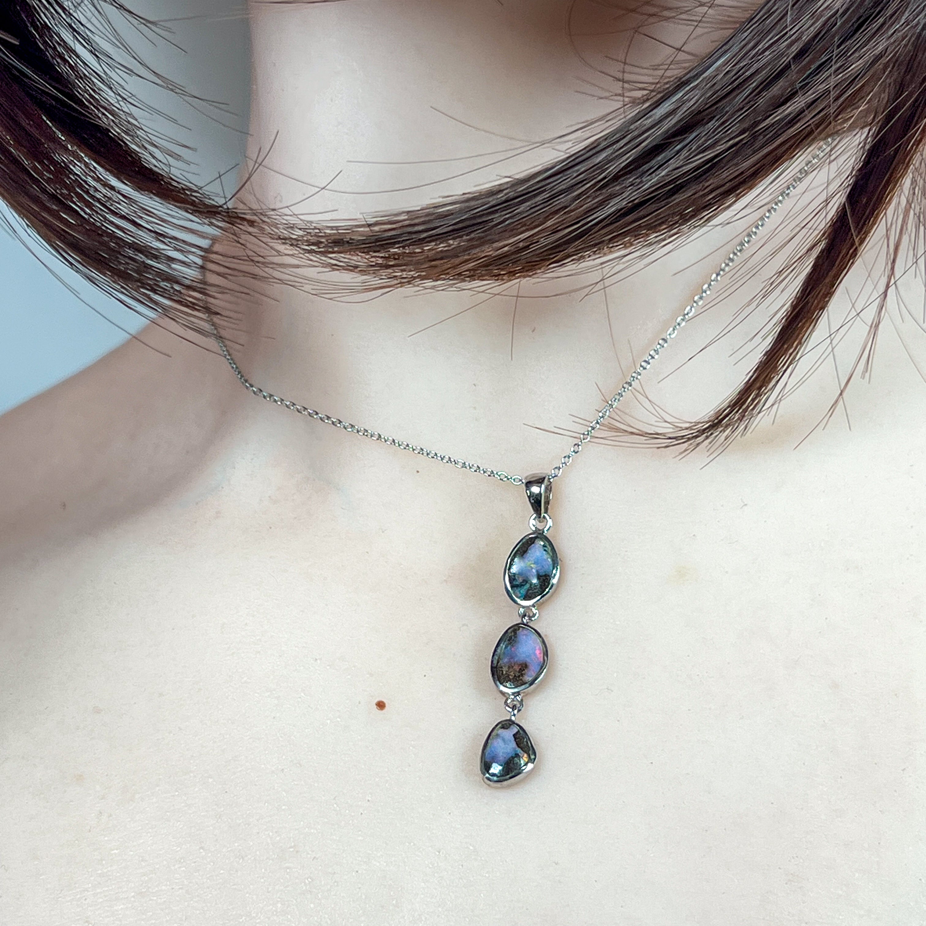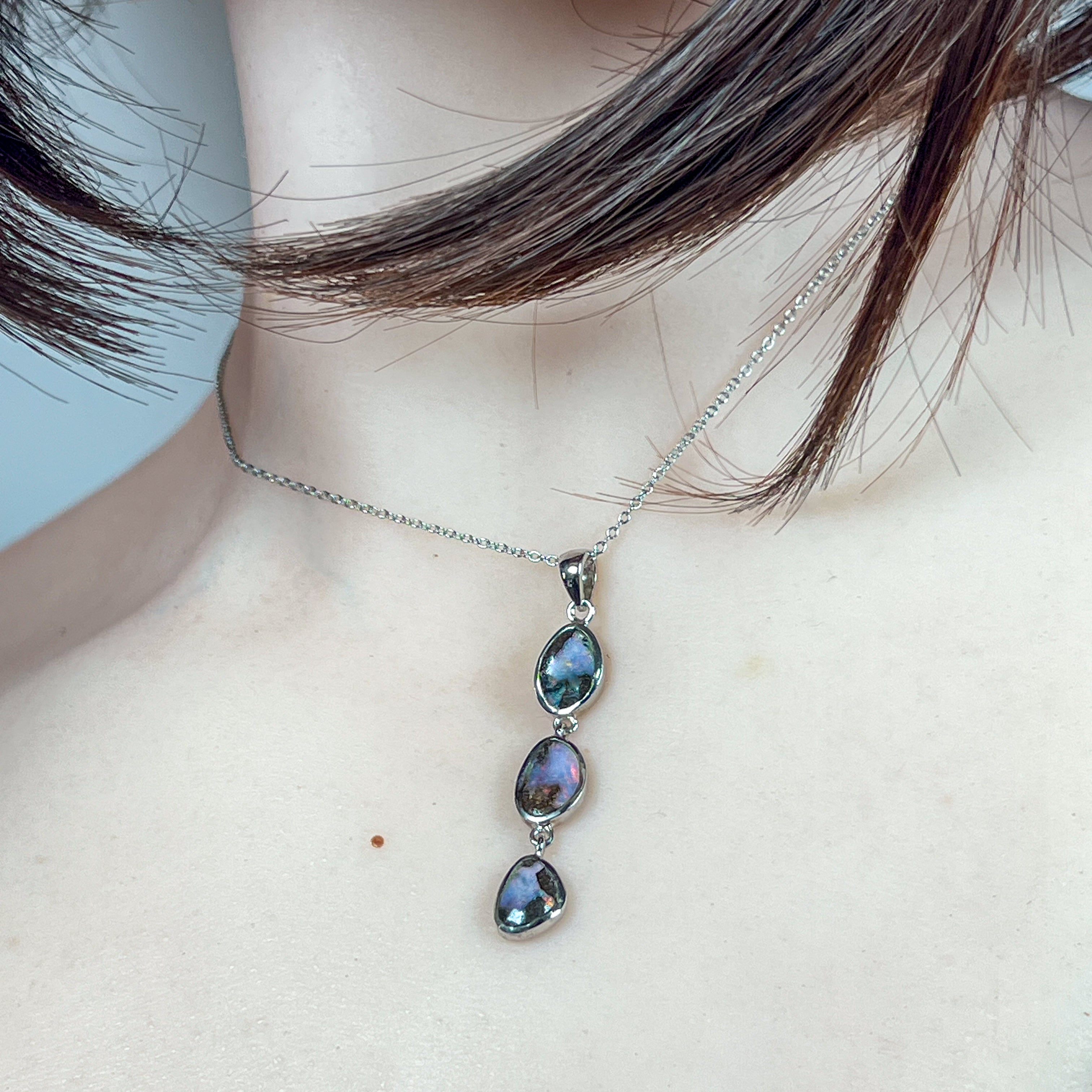 Elevate your everyday sparkle with this stunning three-stone drop pendant that's equal parts sophisticated and fun. Featuring genuine boulder opal in a sleek sterling silver setting, it catches the light with mesmerizing flashes of colour that shift and dance as you move. The cascading design adds movement and dimension to any outfit, while the quality craftsmanship ensures it'll be a cherished piece for years to come. Perfect for opal lovers who refuse to compromise on style or substance.