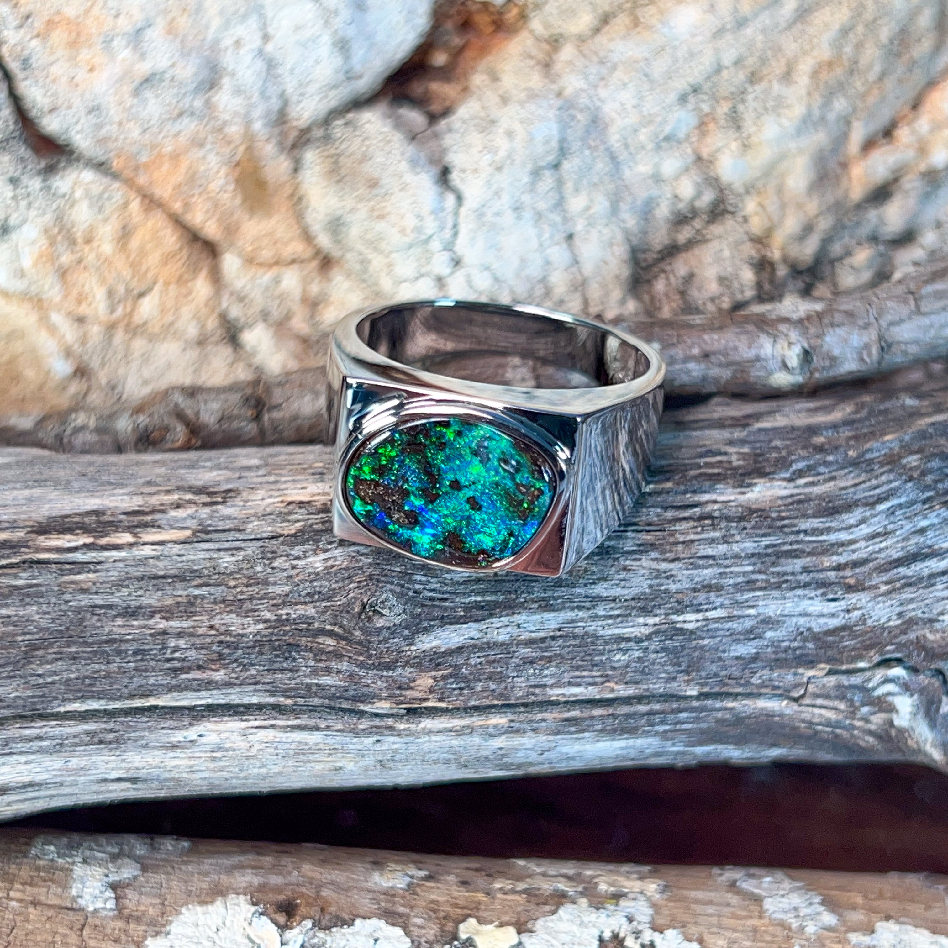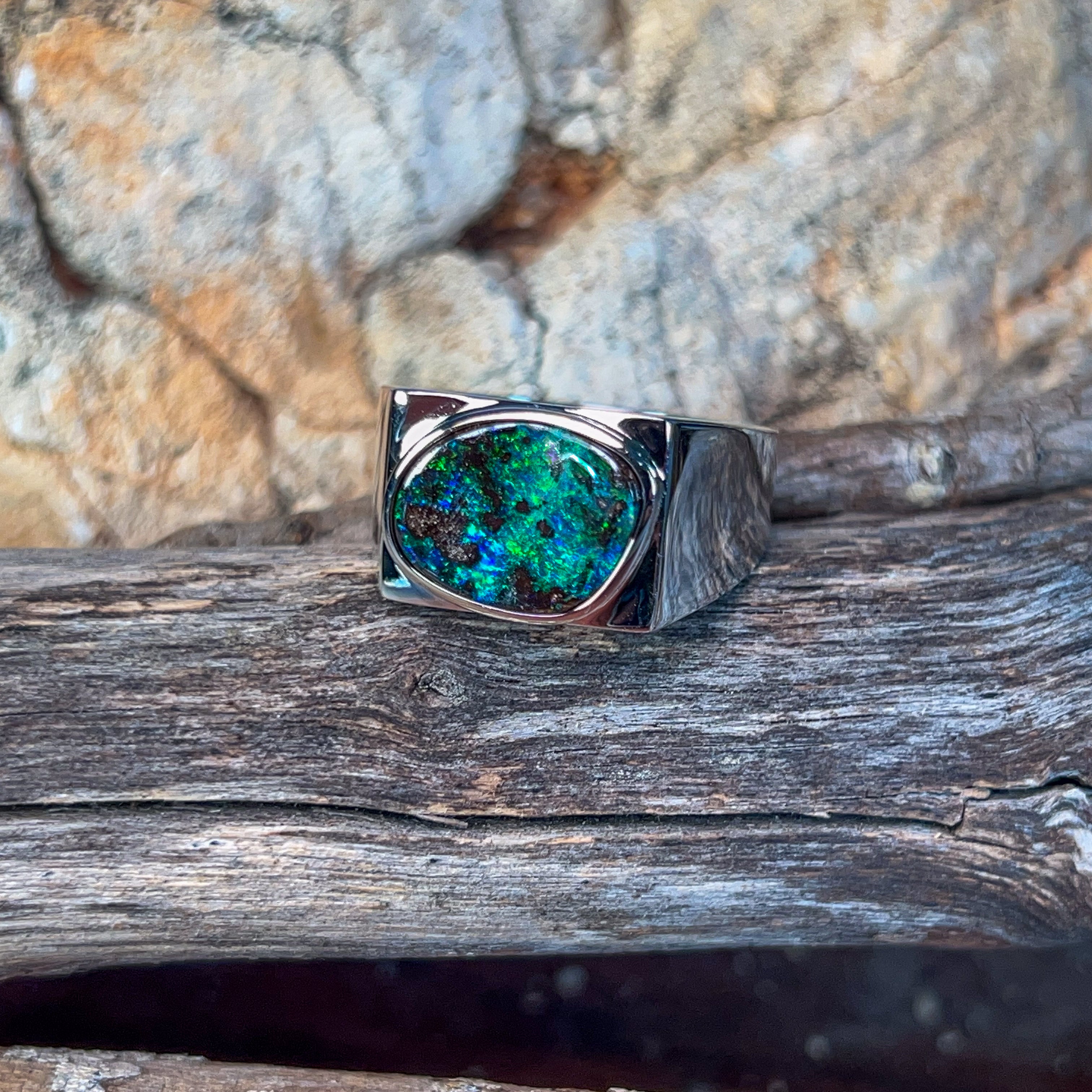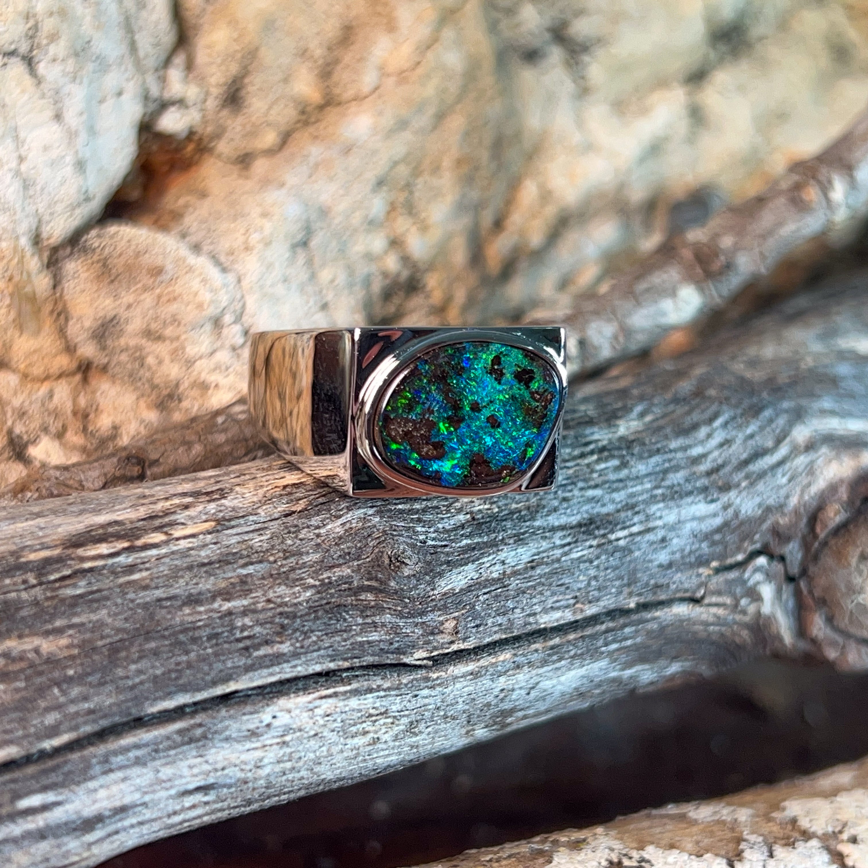 This striking sterling silver ring showcases a magnificent 5.2-carat boulder opal, expertly secured in a sleek bezel setting that lets the stone's natural beauty take centre stage. Perfect for the modern man who appreciates genuine gemstones and understated elegance, this piece combines timeless craftsmanship with contemporary style. The robust design sits comfortably on the finger, making it ideal for everyday wear or special occasions. Boulder opal's unique patterns ensure your ring is truly one-of-a-kind—no two stones are ever alike. A versatile statement piece that speaks volumes without saying a word.