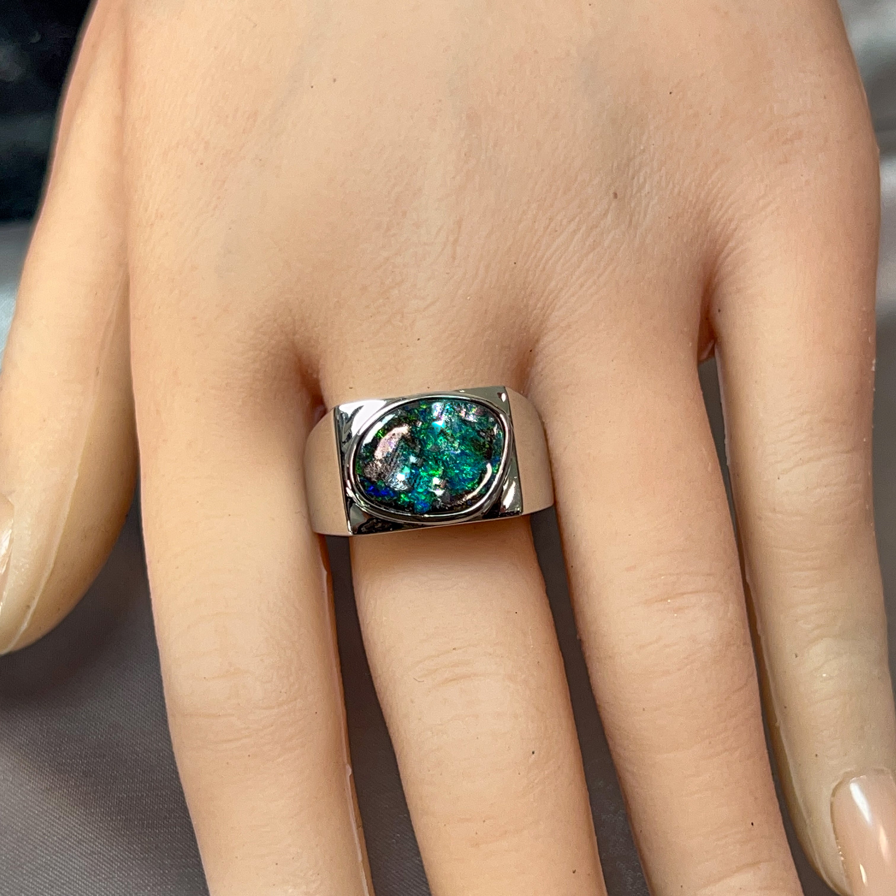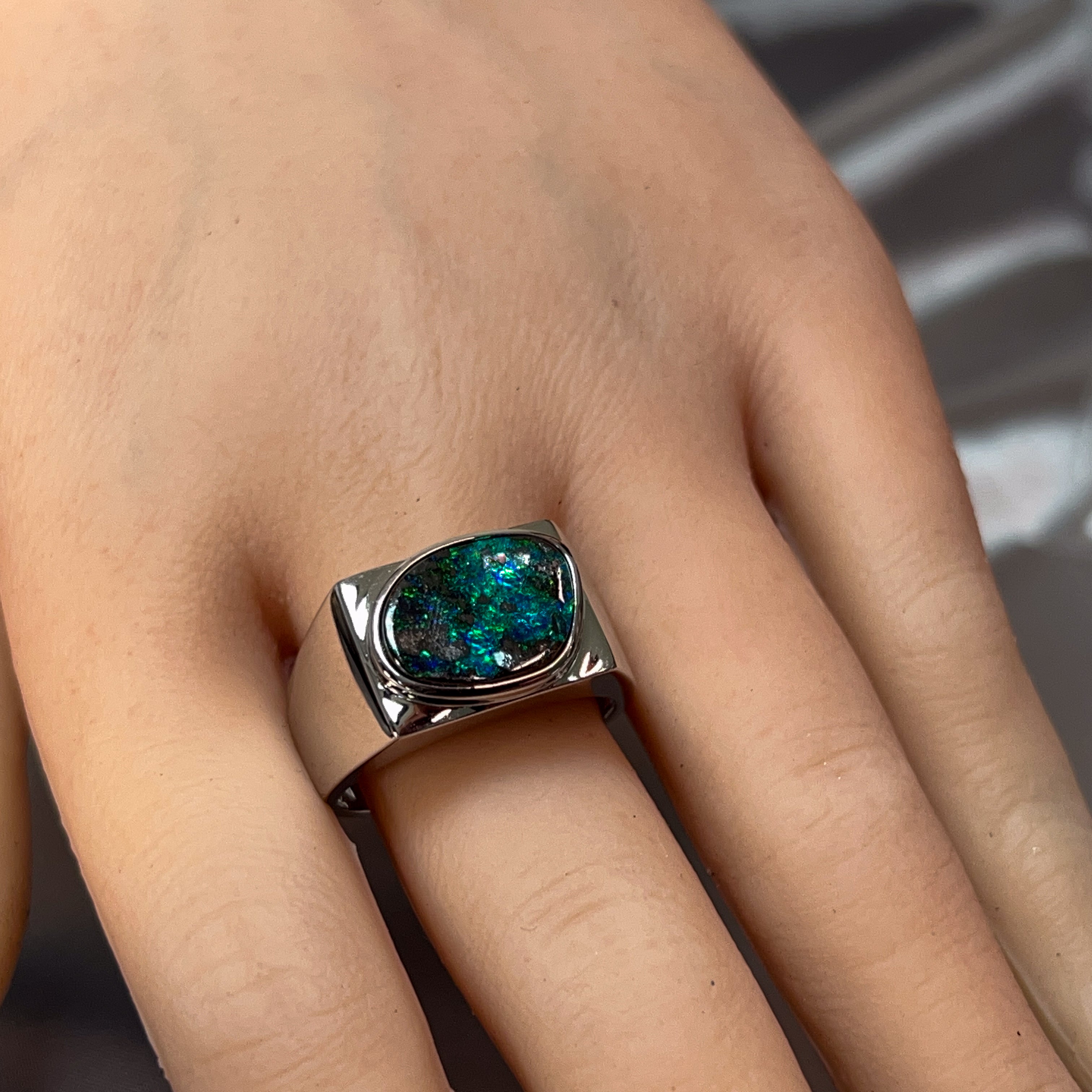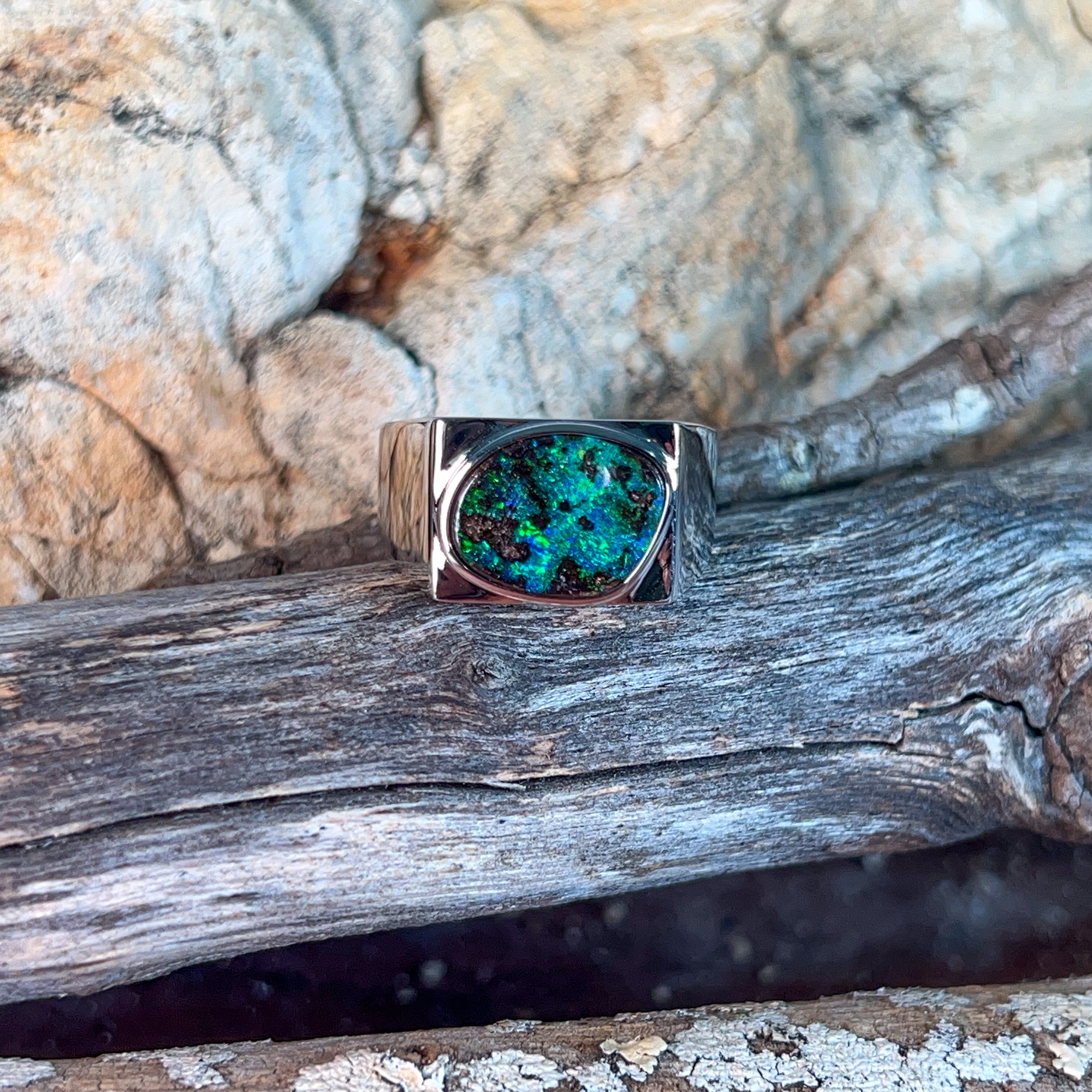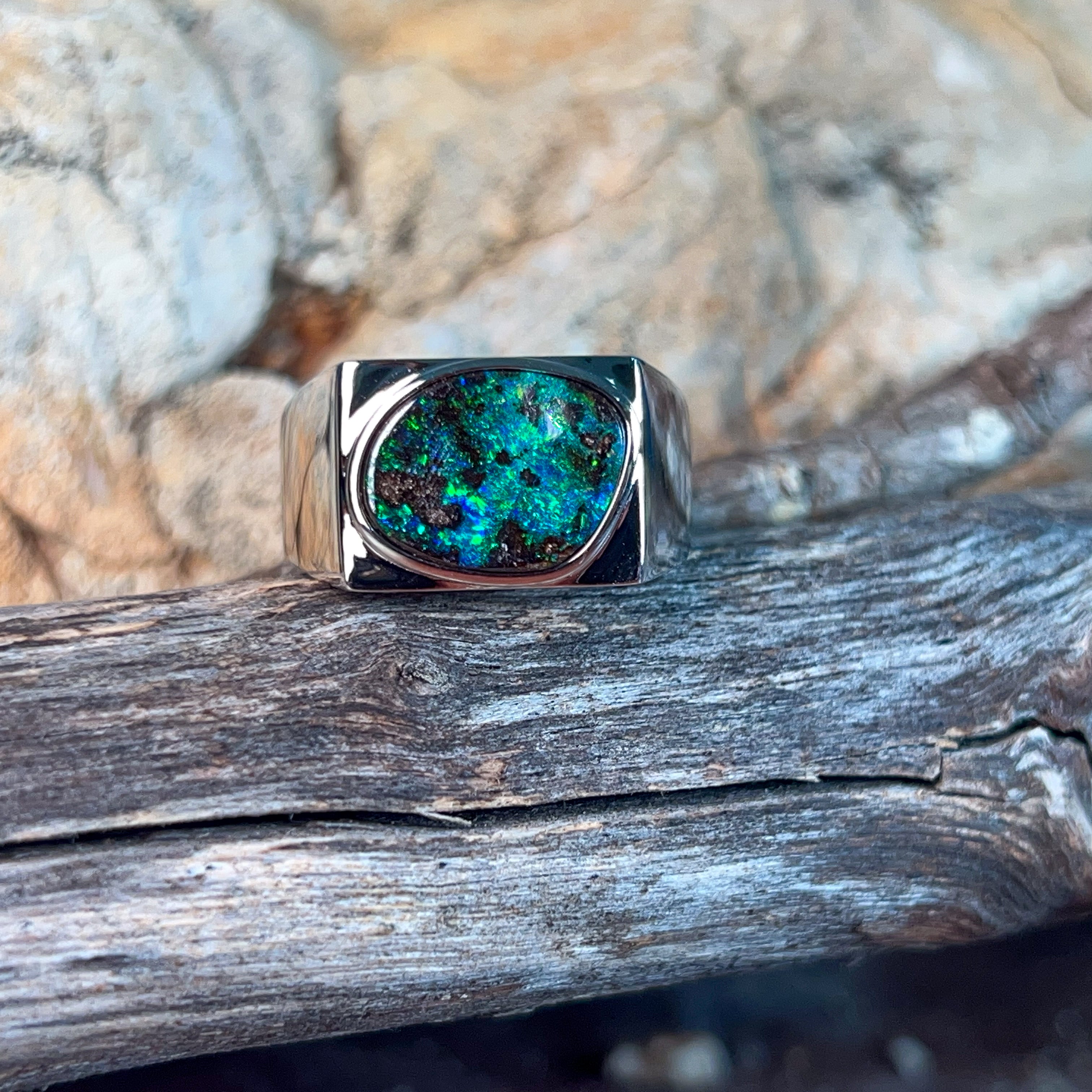 This striking sterling silver ring showcases a magnificent 5.2-carat boulder opal, expertly secured in a sleek bezel setting that lets the stone's natural beauty take centre stage. Perfect for the modern man who appreciates genuine gemstones and understated elegance, this piece combines timeless craftsmanship with contemporary style. The robust design sits comfortably on the finger, making it ideal for everyday wear or special occasions. Boulder opal's unique patterns ensure your ring is truly one-of-a-kind—no two stones are ever alike. A versatile statement piece that speaks volumes without saying a word.