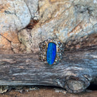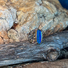 Make a bold statement with this striking Sterling Silver ring featuring a freeform Australian Opal Doublet as its showstopping centrepiece. The 17x7mm blue-green opal (3.45ct) is bezel set in a two-tone reef design, complemented by four accent gemstones—two amethysts and two blue topazes—that enhance the opal's natural play of colour. Crafted in quality sterling silver and weighing 6.4g, this substantial ring commands attention on any hand. Size P. A true masterpiece for those who love bold, distinctive jewellery.