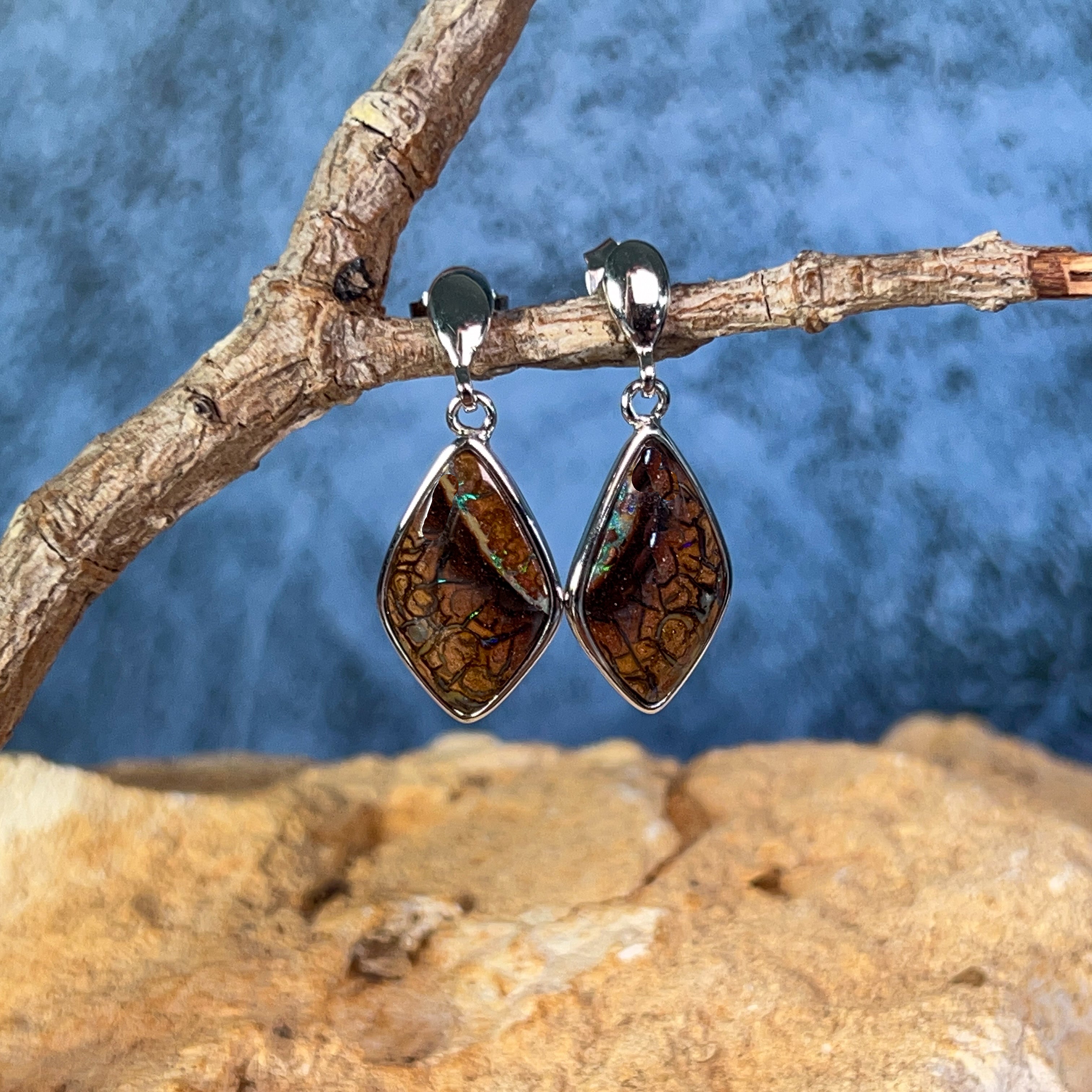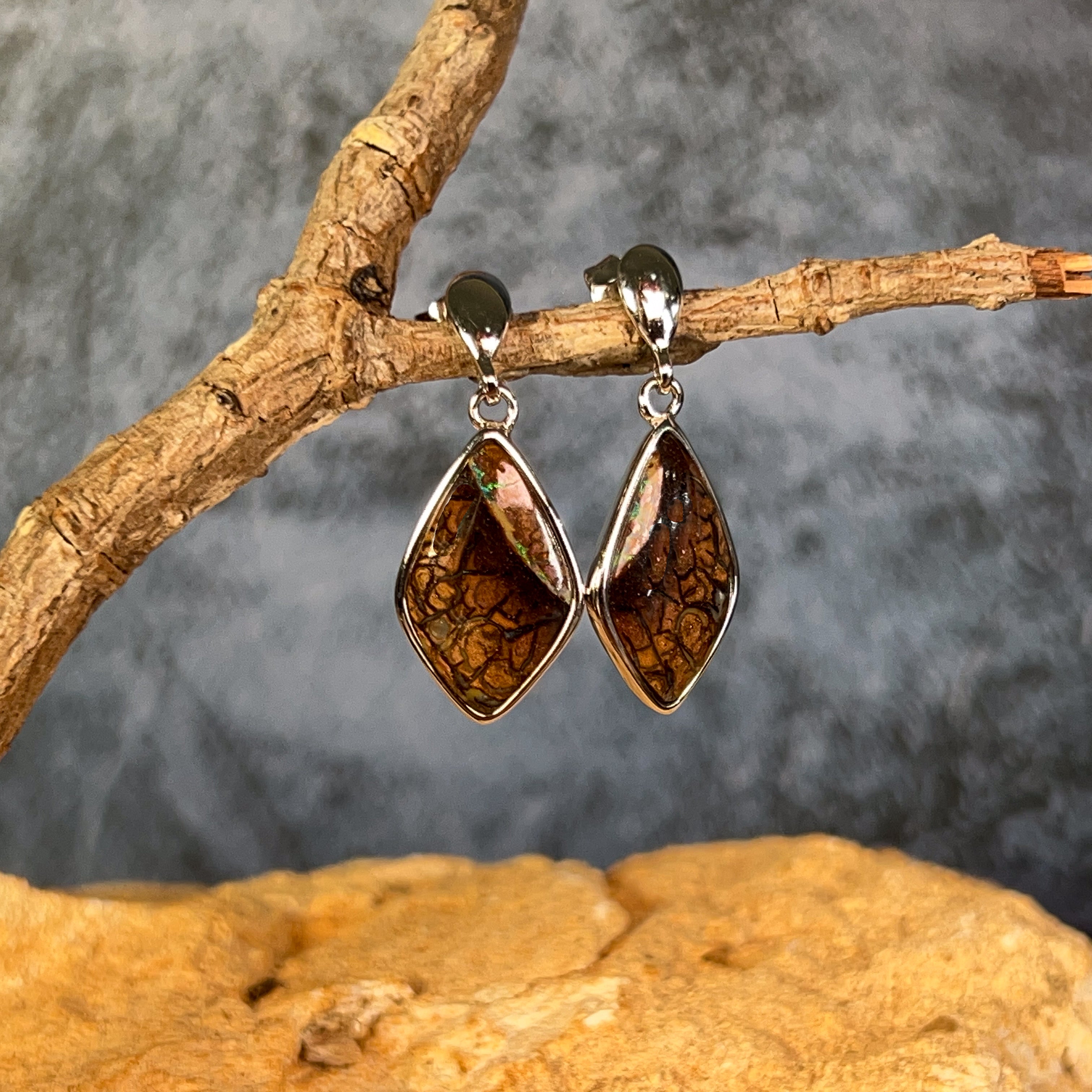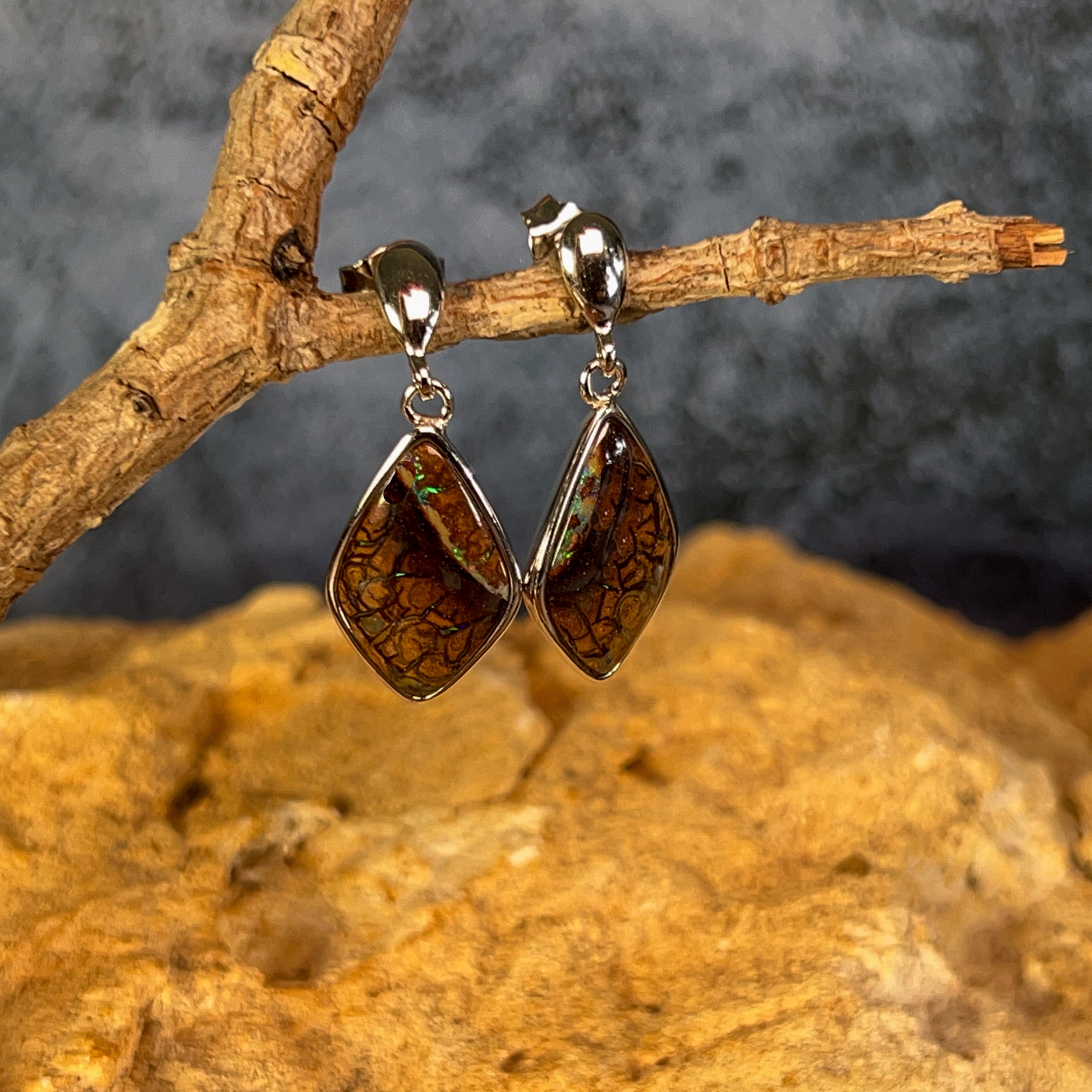 Discover the natural beauty of Australian Boulder Matrix Opal in these captivating sterling silver earrings. Each piece showcases the distinctive patterns and rich earth tones unique to matrix opals, creating an effortlessly elegant look that complements any style. The gentle dangle design adds movement and grace, while premium sterling silver ensures lasting durability and a brilliant shine. Perfect for those who appreciate genuine gemstones and timeless sophistication, these earrings bring organic charm and understated luxury to your everyday collection.
