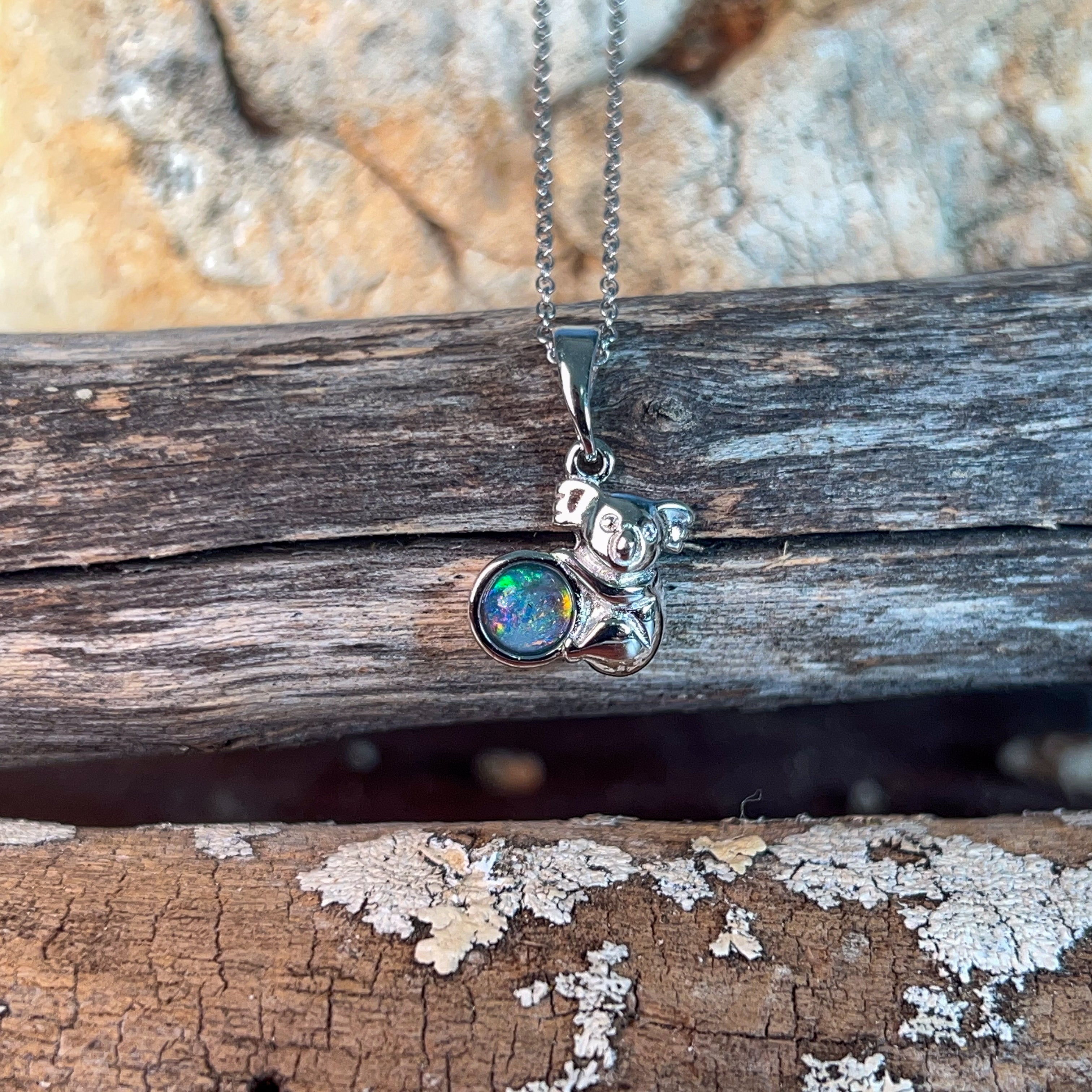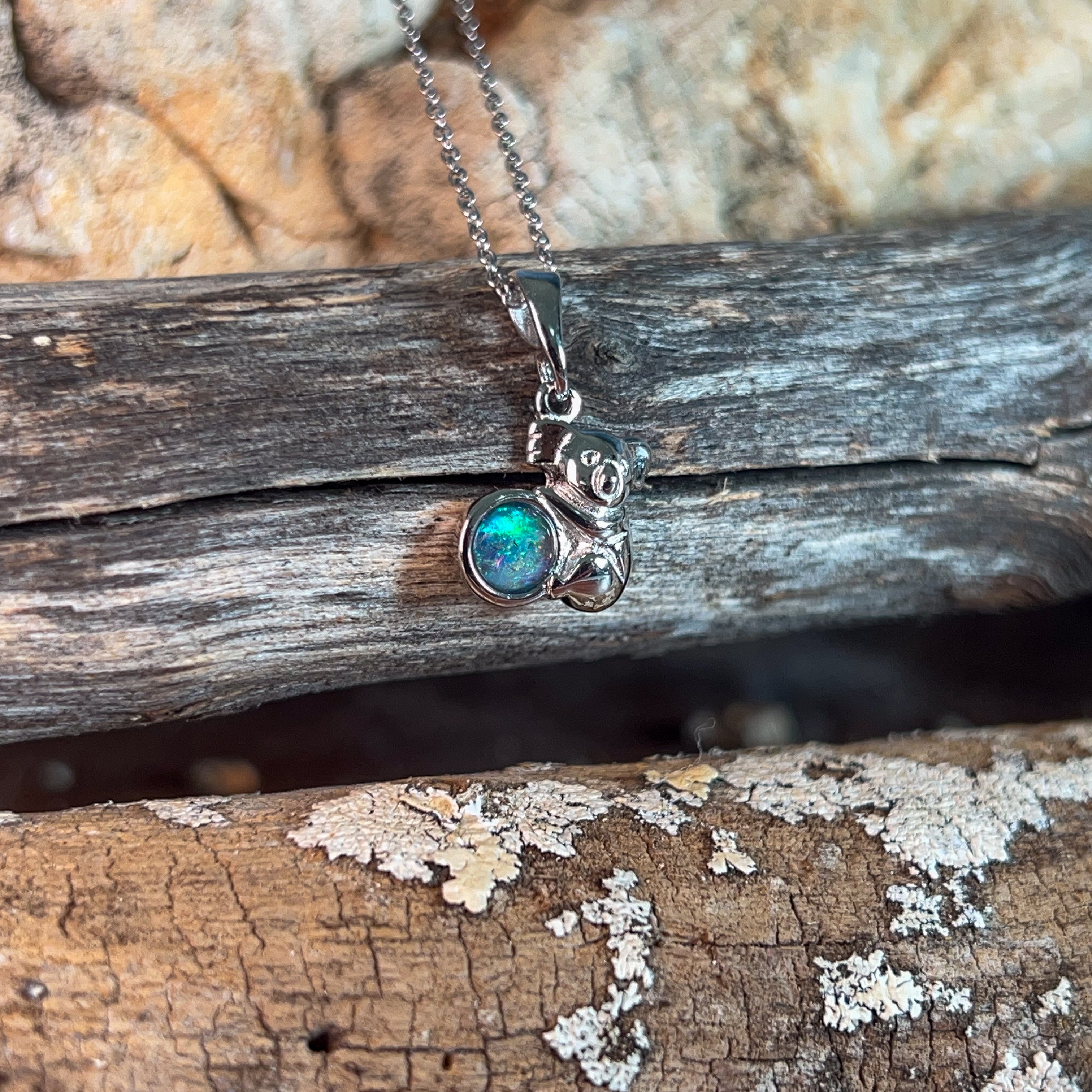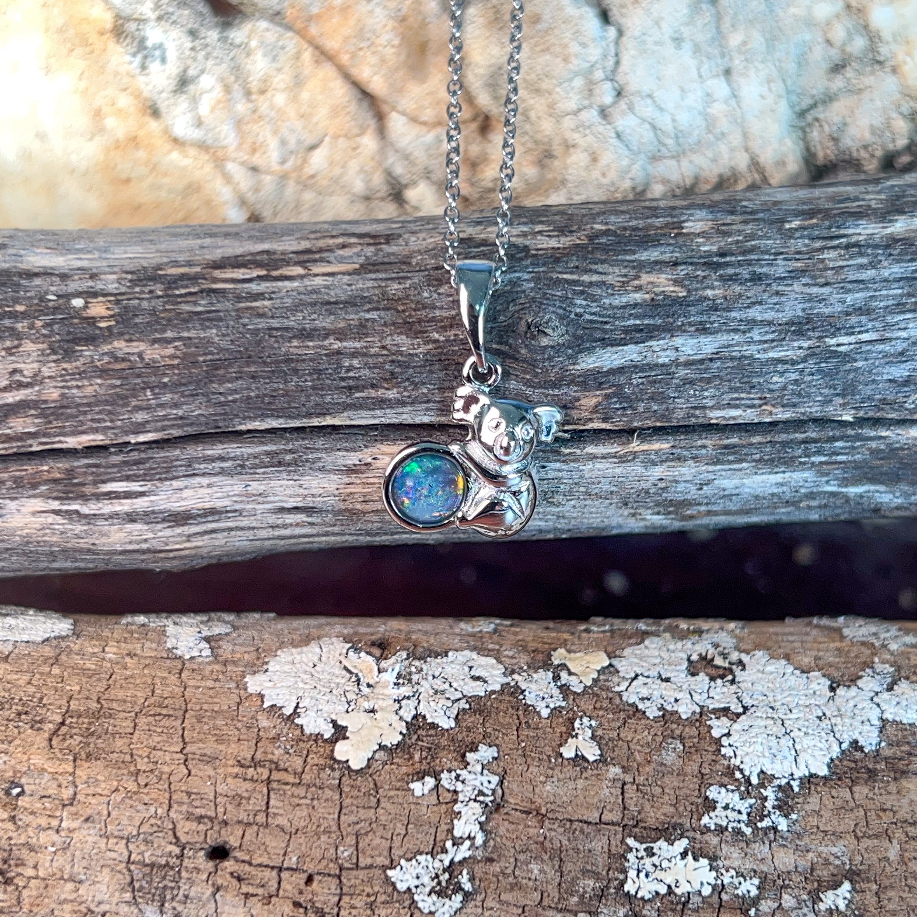 Adorable sterling silver pendant featuring a charming koala cradling a brilliant 5mm opal triplet. This delicate design captures the gentle spirit of Australia's beloved marsupial, with the opal's mesmerizing play-of-colour adding a touch of magic. Perfect for opal lovers and wildlife enthusiasts alike, this dainty piece brings whimsy and natural beauty to any jewellery collection. A sweet reminder of nature's wonders, worn close to your heart.