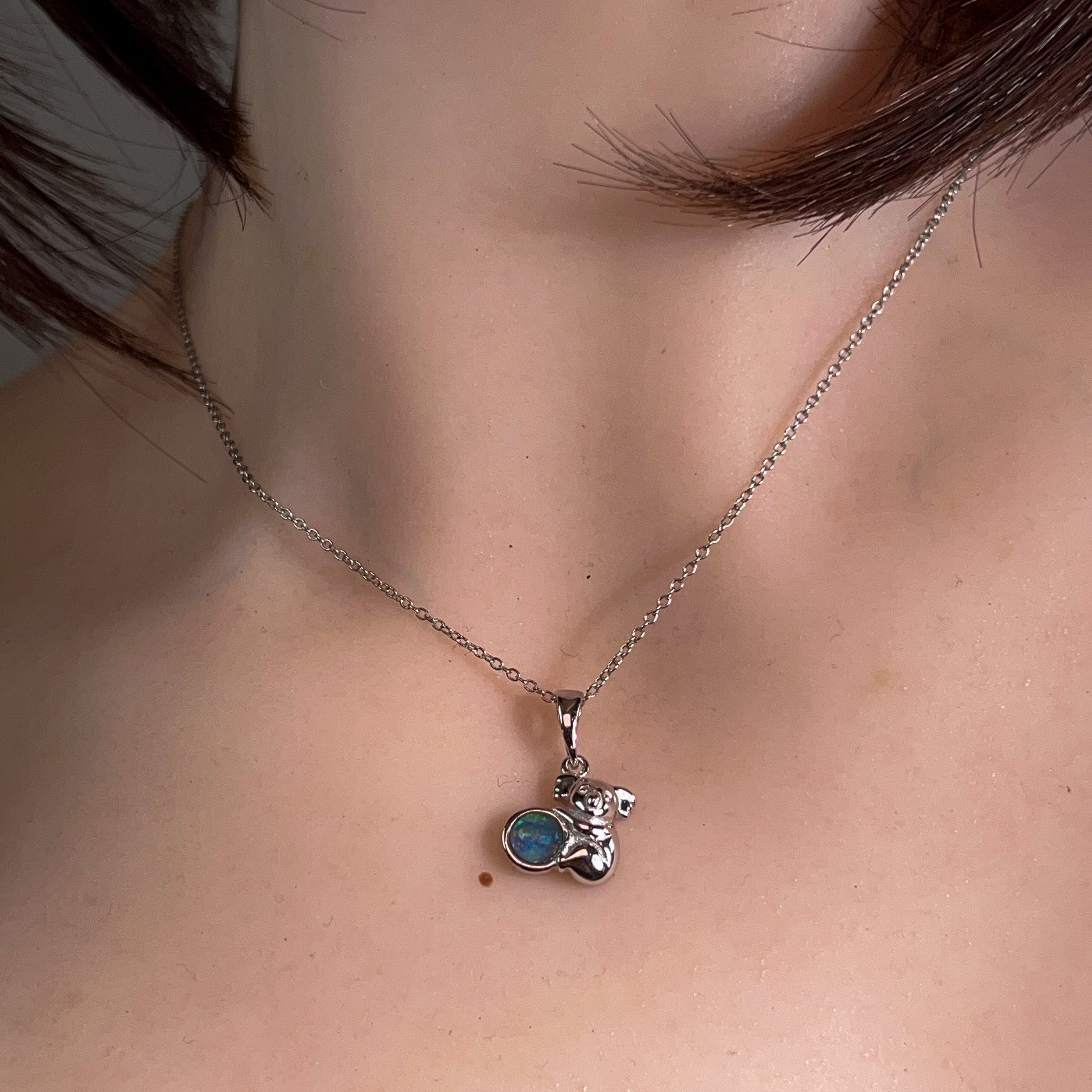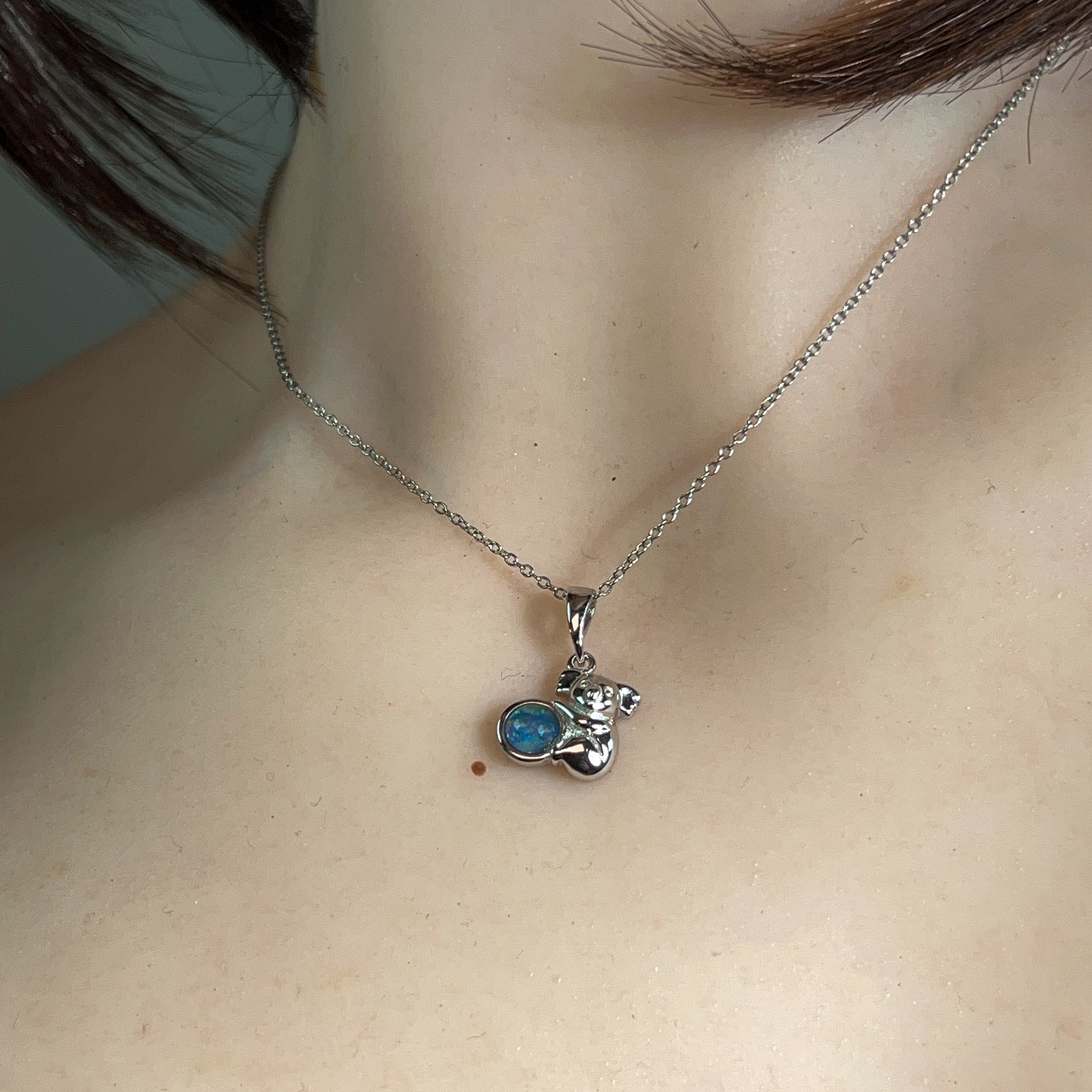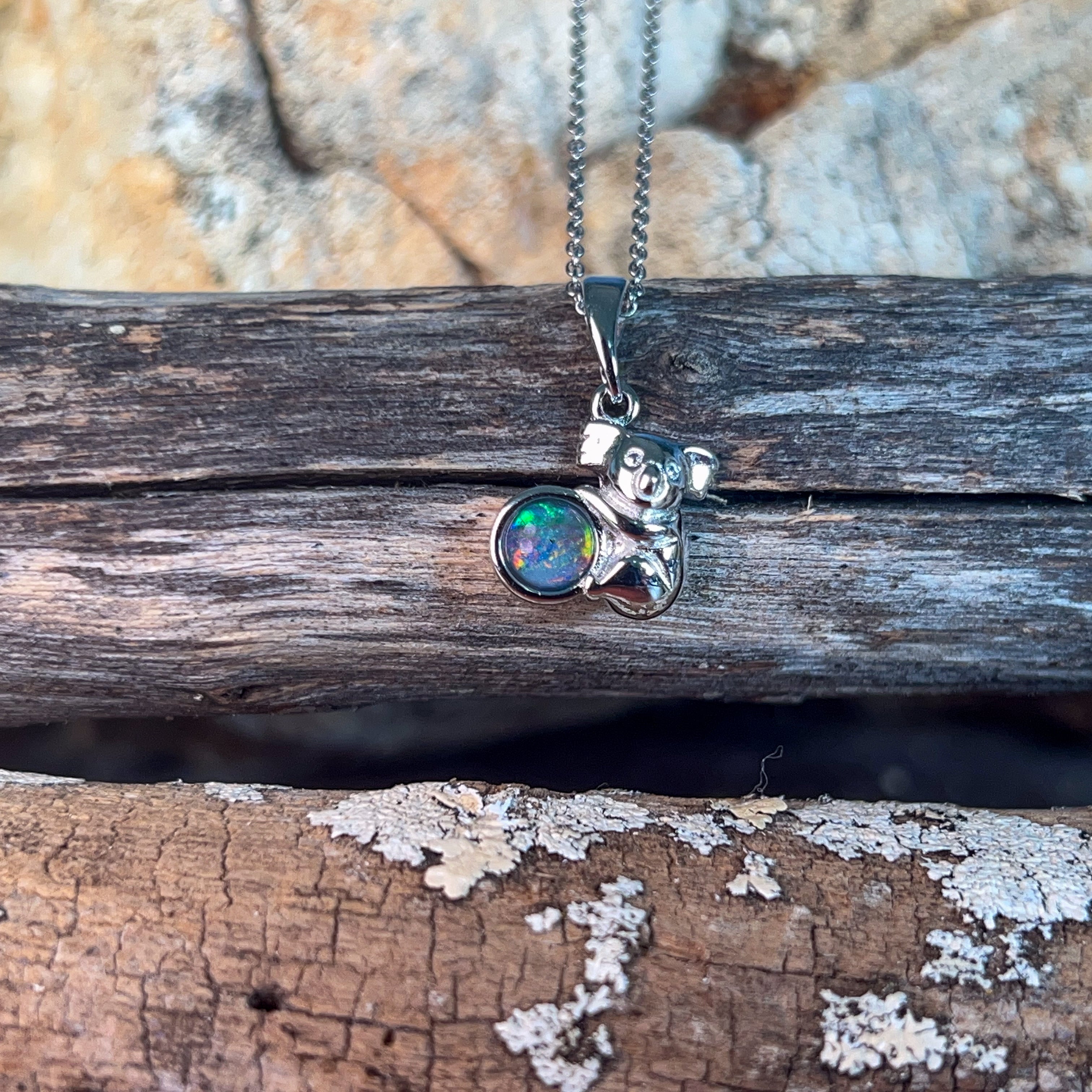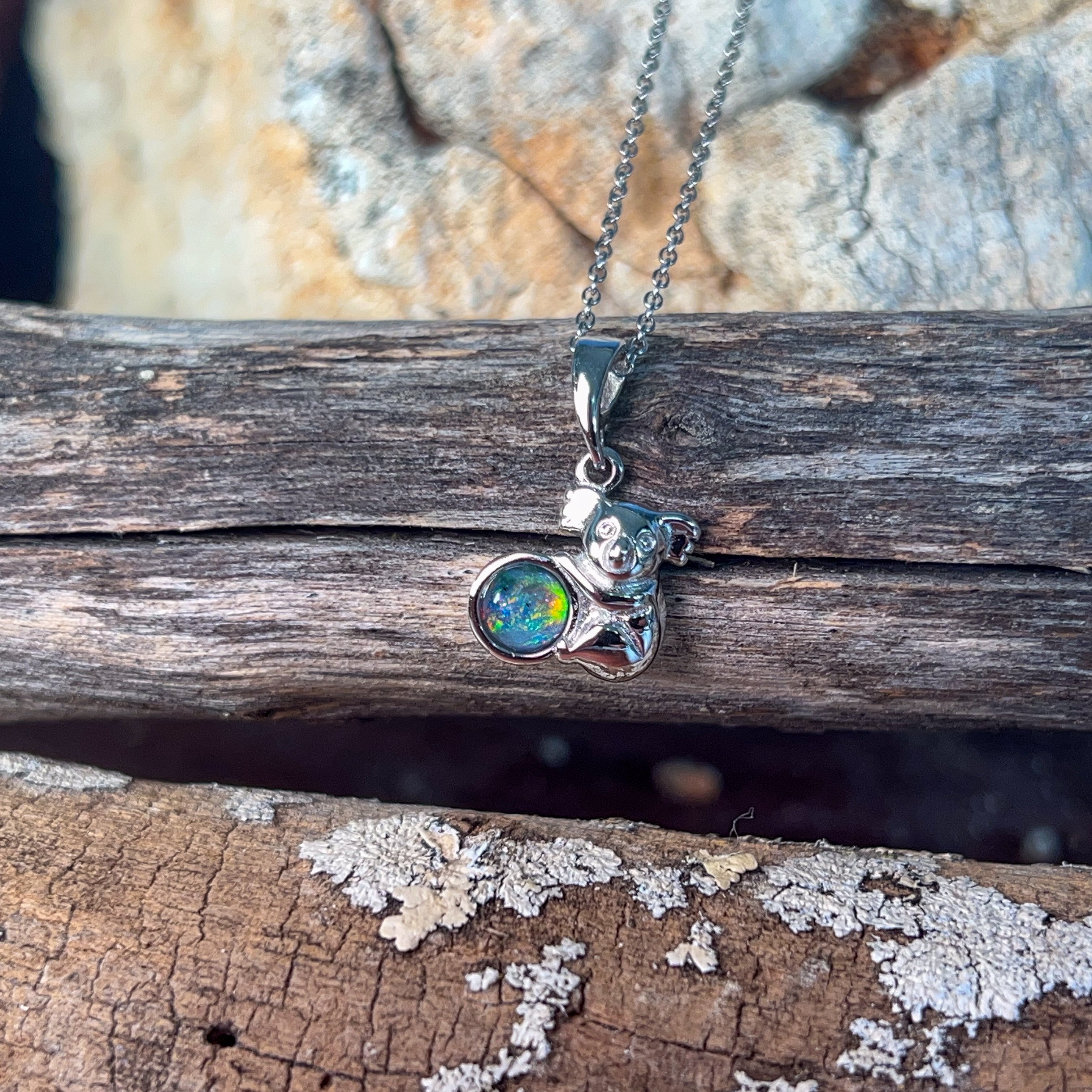 Adorable sterling silver pendant featuring a charming koala cradling a brilliant 5mm opal triplet. This delicate design captures the gentle spirit of Australia's beloved marsupial, with the opal's mesmerizing play-of-colour adding a touch of magic. Perfect for opal lovers and wildlife enthusiasts alike, this dainty piece brings whimsy and natural beauty to any jewellery collection. A sweet reminder of nature's wonders, worn close to your heart.