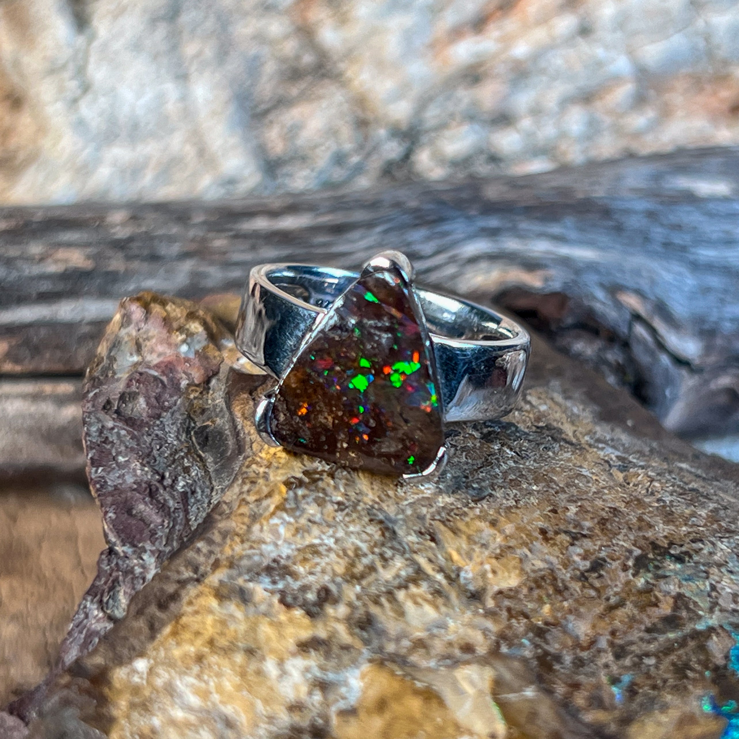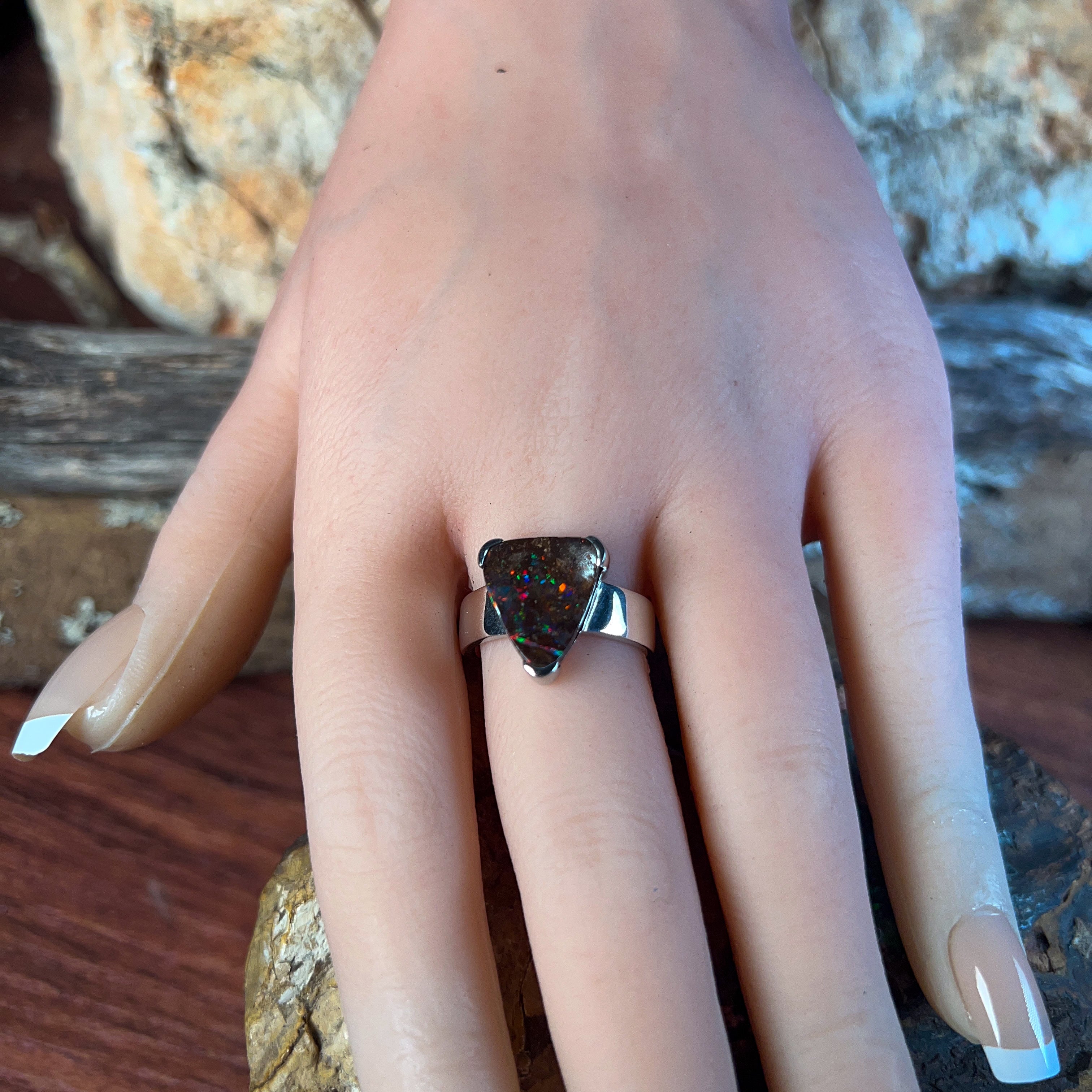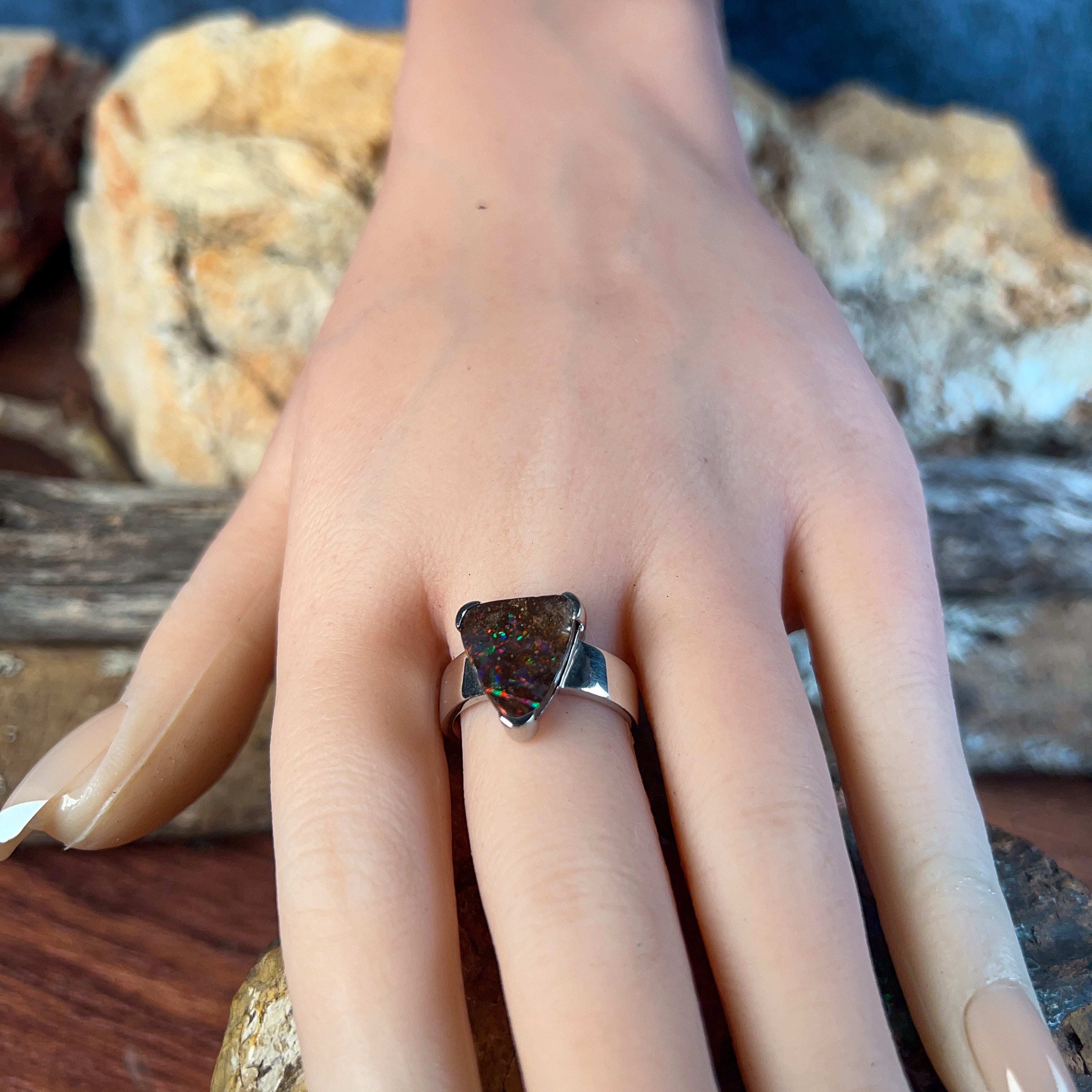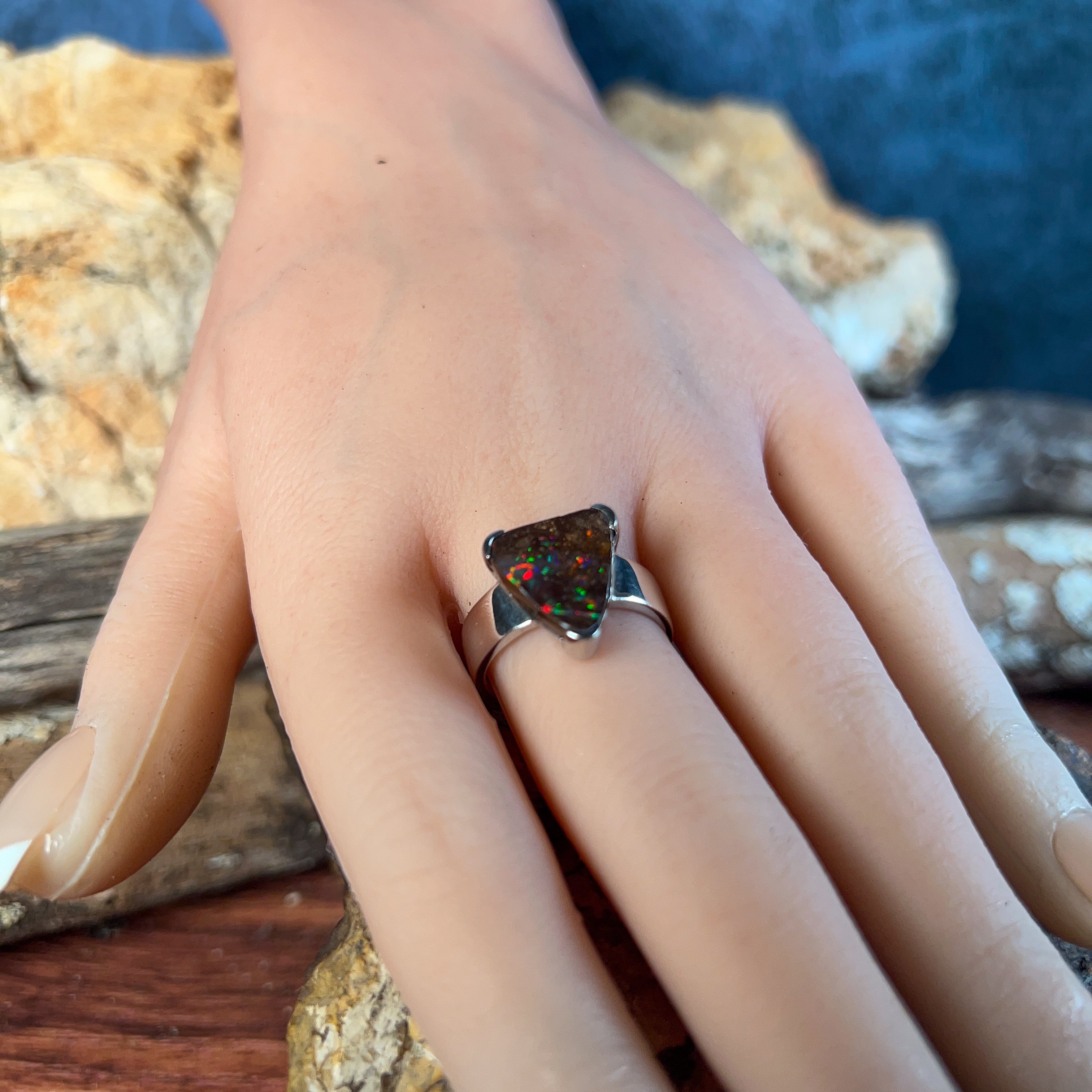 Catch the light and turn heads with this stunning sterling silver triangle ring, featuring a mesmerizing boulder opal that sparkles with every movement. The geometric design brings modern edge to a timeless gemstone, while the bright, dancing flashes of colour make it impossible to ignore. Perfect for those who love statement pieces that celebrate nature's artistry. A playful twist on classic elegance that'll have everyone asking where you found it.