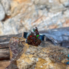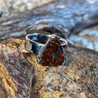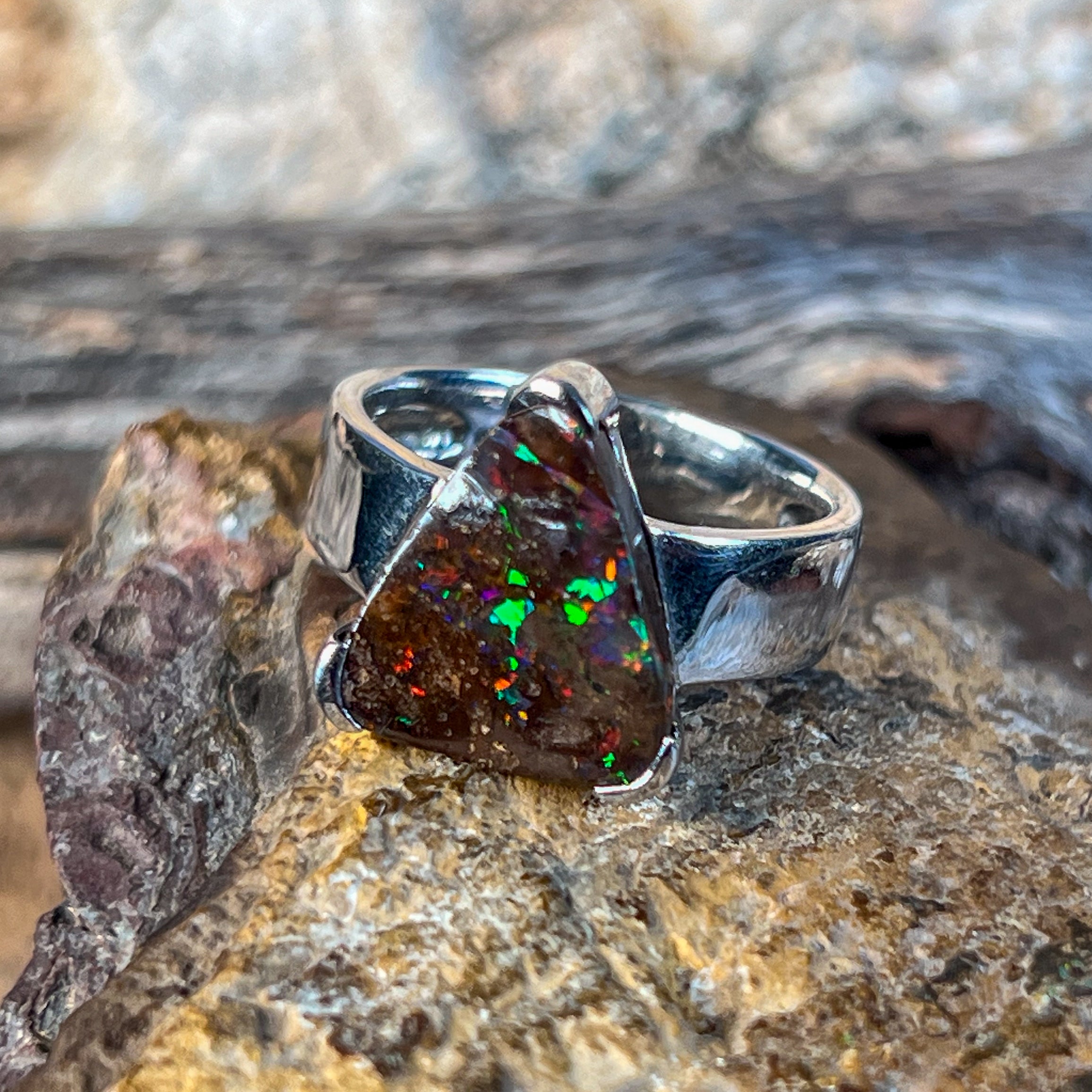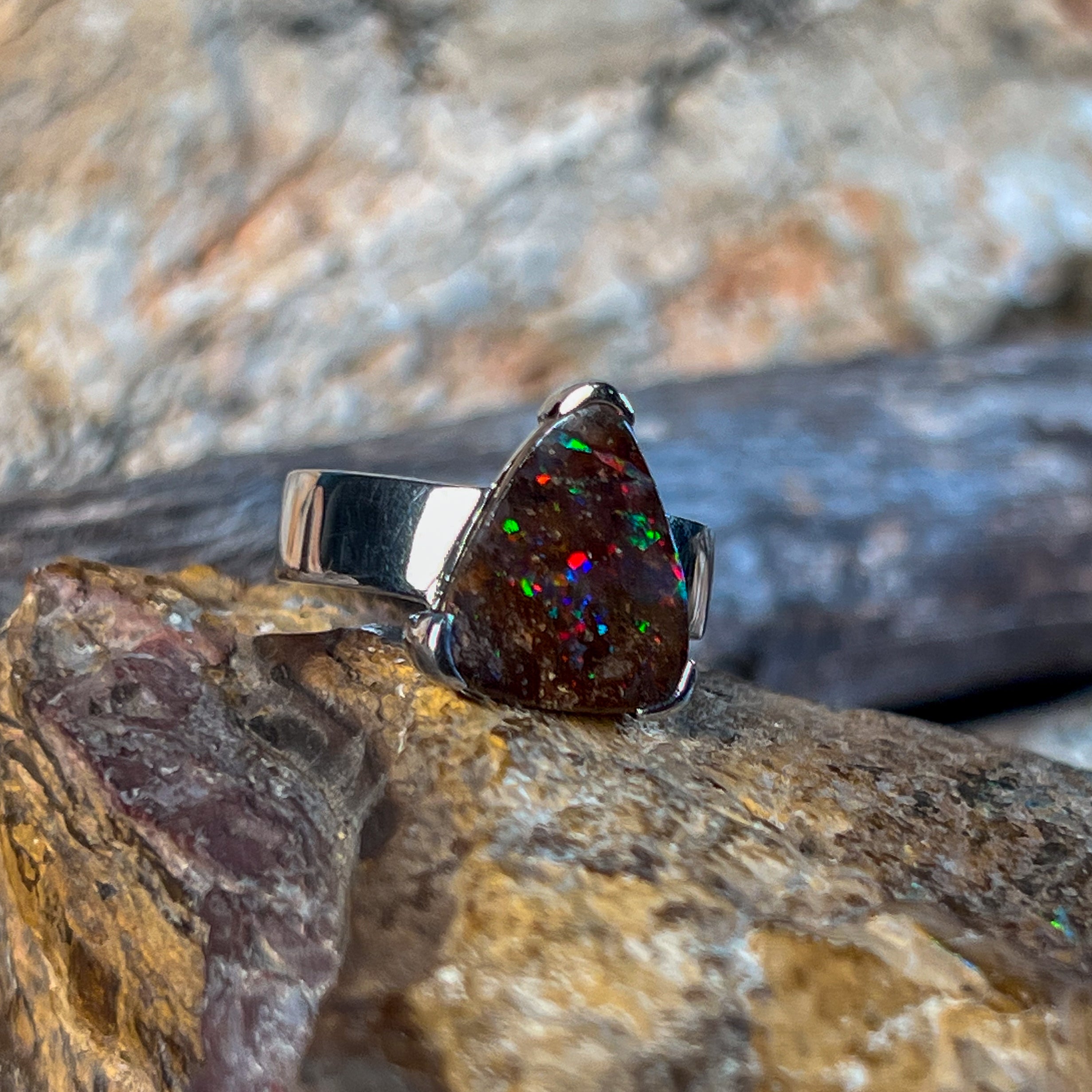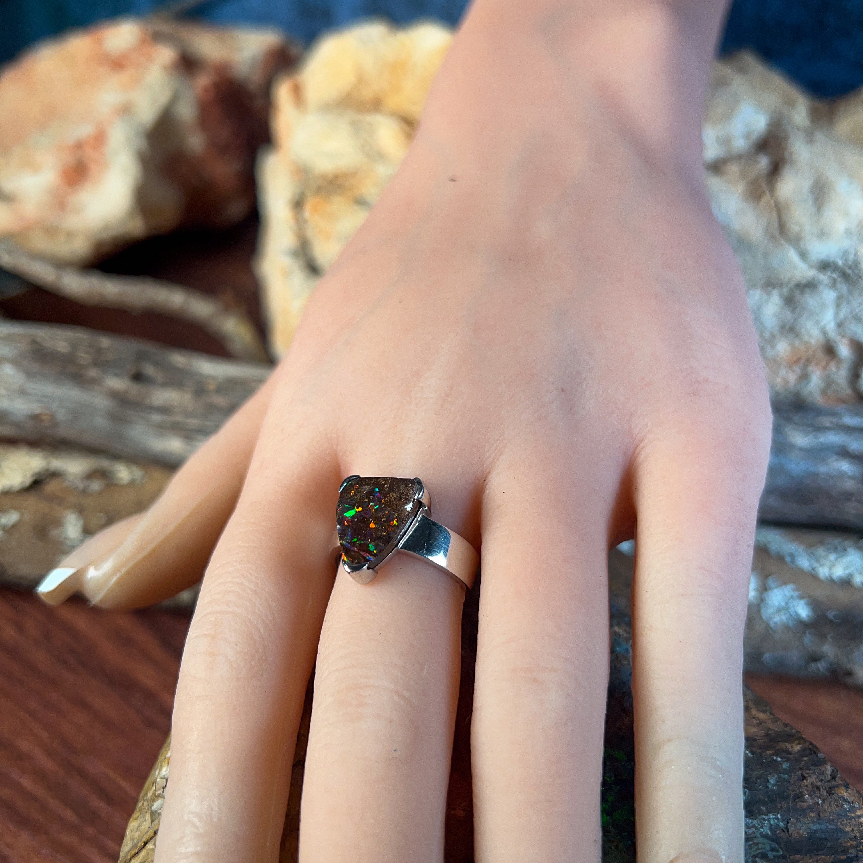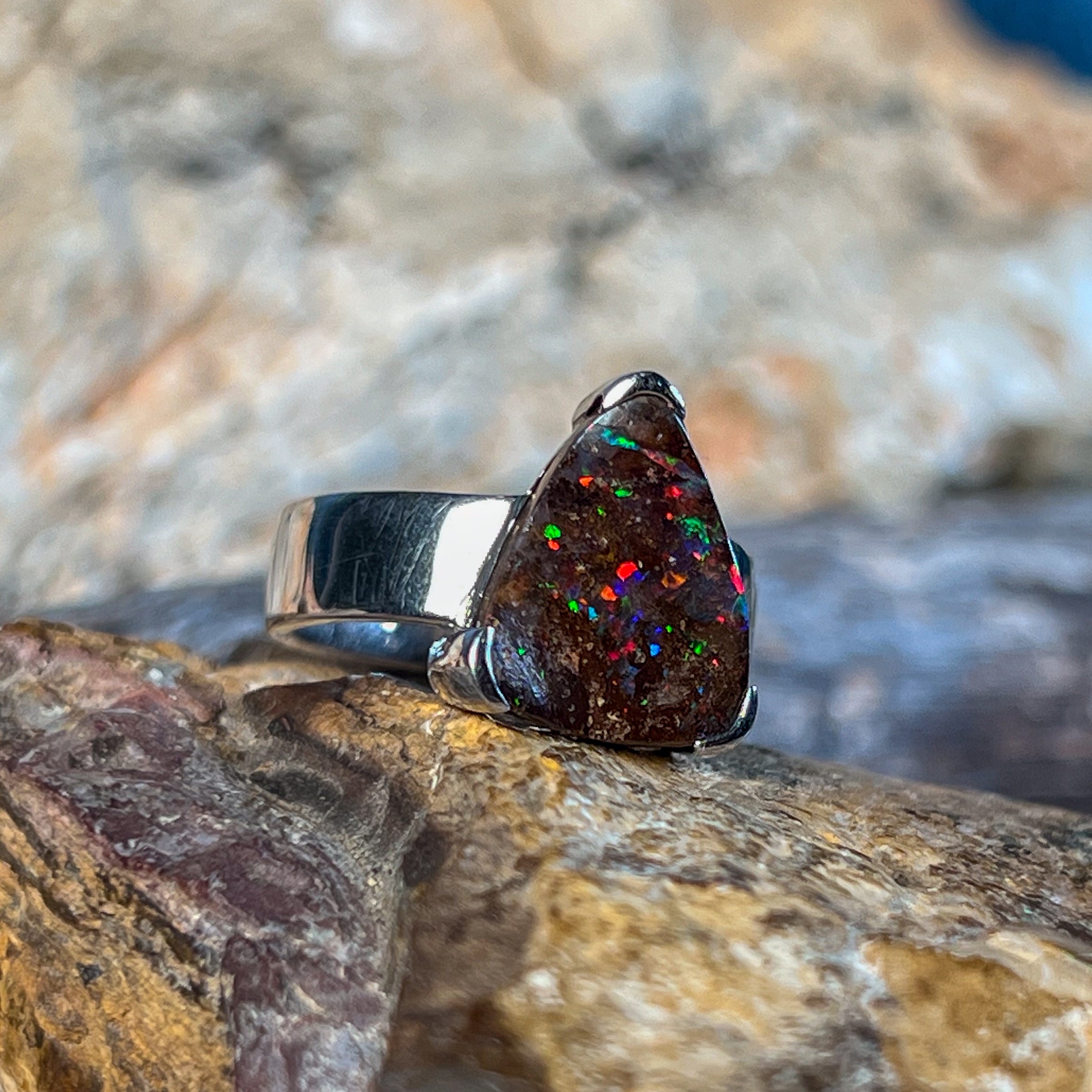 Catch the light and turn heads with this stunning sterling silver triangle ring, featuring a mesmerizing boulder opal that sparkles with every movement. The geometric design brings modern edge to a timeless gemstone, while the bright, dancing flashes of colour make it impossible to ignore. Perfect for those who love statement pieces that celebrate nature's artistry. A playful twist on classic elegance that'll have everyone asking where you found it.